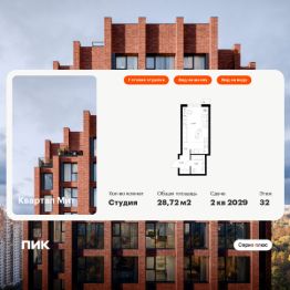 Новостройка! Продается 1-комн. кв-ра площадью 28,72 кв.м, (Корпус 3.4, Секция 4) 22 этаж 32-этажного дома в Квартал Мит от ПИК. ''Квартал Мит'' строится в экологически чистом районе Митино, где по соседству расположен большой лесопарк, а с двух сторон протекают реки Сходня и Журавка. Для семей с детьми здесь появится школа и два детских сада.В 20 минутах пешком находится станция метро ''Пятницкое шоссе'', а за 10 минут на автомобиле можно доехать до МКАД. Архитектура от бюро Slava+Концепция квартала сочетает эстетику и функциональность. Башня-доминанта цвета красной охры и разновысотные корпуса терракотового, белого и графитового оттенков формируют узнаваемый силуэт современного городского пространства. Просторные террасы, разнообразные балконы и окна в пол придают облику динамичность и дарят квартирам уютные места для отдыха.Первые этажи с панорамными окнами создают сцену для яркой городской жизни. Здесь появятся пространства для прогулок, летние террасы, рестораны и коммерческие помещения. Комфорт ''Серии плюс''При входе в дом жителей встретят светлые просторные лобби с высокими потолками — попасть сюда можно как со стороны улицы, так и со двора. В лобби будет зона ожидания, велосипедная и колясочная. Быстро и с комфортом подняться на нужный этаж помогут бесшумные скоростные лифты. На подземном этаже появится паркинг и индивидуальные кладовые, где удобно хранить сезонные вещи. #d06.02# Артикул 1034966 (Застройщик АО СЗ ''ПФК'')