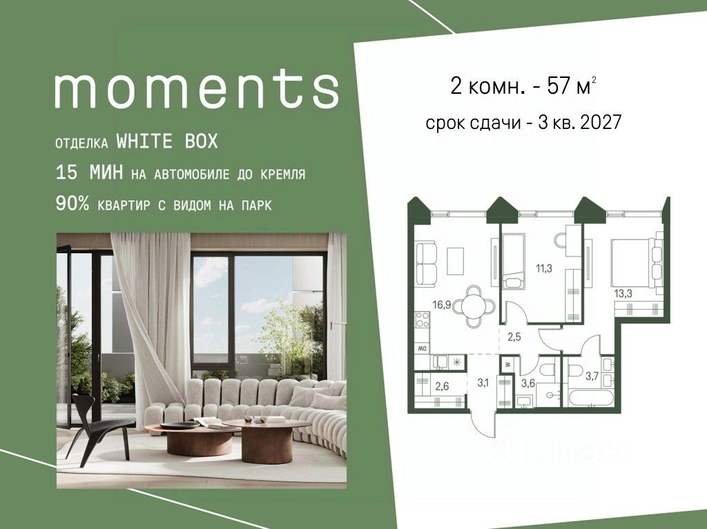 Цены указаны с условием 100% оплаты и стандартной ипотеки. Продается 3-к. квартира номер 198 общей площадью 102.1 кв.м. на 15-м этаже 30 этажного дома, корпус 2.1. С отделкой White Box. Moments — ЖК бизнес-класса, расположен на расстоянии вытянутой руки от старинного усадебного парка Покровское-Стрешнево. Moments — это единение города и природы, дом, который помогает обрести гармонию и баланс в жизни. Moments расположен на Волоколамском шоссе с удобным выездом в центр и в область, а также с расположенными в пешей доступности объектами транспортной инфраструктуры (МЦК и МЦД-2). Жилой комплекс будет состоять из 3 очередей — 8 корпусов высотой от 4 до 47 этажей. Здания будут расположены под разными углами для максимальной открытости солнцу и максимально роскошным видовым характеристикам. Внутренний двор: Иммерсивное благоустройство от британского бюро Gillespies и West8 сфокусировано на эмоциональном и чувственном опыте. Каждая прогулка по Moments погружает в путешествие со сменой сценариев и плавным потоком уникальных моментов. - Пешеходная экотропа,которая соединяет комплекс с парком Покровское-Стрешнево - Двор с фонтаном - Зеленые сады и лаунж-зоны - Пространства для пикников и общения - Зоны активного отдыха. Детские и спортивные площадки - Пешеходные тропы и велодорожки - Разнообразная коммерческая инфраструктура - Детский сад на 175 мест - Школа на 300 мест - Игровые площадки из натуральных материалов - Сенсорные сады - Безбарьерное зонирование