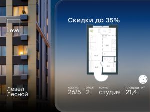 Цена указана с учётом скидки при 100%-й оплате, несубсидированной ипотеке, рассрочке (кроме программы ''Рассрочка 0%'').В районе, утопающем в густой зелени лесов, многочисленных парков и скверов, продаётся студия площадью 21.40 кв.м с отделкой white box. Квартира расположена на 2 этаже в жилом комплексе комфорт-класса Левел Лесной (компания Level Group/Левел групп). Жилой квартал Левел Лесной расположен в посёлке Отрадное Красногорского района Московской области. Это уникальный природный уголок вблизи района Митино. Посёлок окружён обширными лесными массивами. Обилие зелени создаёт благоприятный экологический фон и превращает этот район в оазис спокойствия и единения с природой.Расположение и инфраструктура:- Район окружен роскошной зеленью лесов и парковых зон, занимающих территорию свыше 1 000 гектаров, среди них лесопарк внутри жилого комплекса, загородный парк ''Отрада'', Митинский лесопарк, набережная реки Синички.- Идеальные условия для активного отдыха в любое время года: пешие и велопрогулки, бег, зимой - лыжи и катание на ватрушках.- На территории ЖК - частная школа ''Светлые Горы'', входящая в топ лучших школ Москвы и Подмосковья (Forbes Education, 2023), и детский сад, в пешей доступности расположены 9 детских садов.- На территории жилого комплекса - сетевые супермаркеты, локальные магазины, аптеки, салоны красоты, рестораны и другие объекты инфраструктуры в сданных корпусах. В 12 мин. пешком - крупный торговый парк ''Отрада'' с гипермаркетами, кинотеатром и детскими развлечениями.Отличная транспортная доступность:- 25 мин. пешком до станции метро ''Пятницкое шоссе'',- 28 мин. на автобусе до станции метро и МЦД-2 ''Волоколамская'',- 11 мин. на авто до МКАД,- 25 мин. на авто до ТТК.Продуманный архитектурный проект:- Концепция проекта Левел Лесной разработана бюро СПИЧ,- Высотность комплекса до 15 этажей с уникальными видами на лесные массивы и город,- Высота потолков до 3 м,- Современные окна высотой до 1,6 м, в части квартир предусмотрены окна в пол. Высота подоконников 0,6 м.Благоустройство:Продуманное пространство и аура приватного европейского городка рождают чувство лёгкости и расслабления у каждого, кто попадает на территорию проекта. Концепцию общественных площадок разработали в партнёрстве два архитектурных бюро: Highlight Architecture и SCAPE. В безопасных дворах без машин каждый обязательно найдёт себе место для вдохновения, отдыха и спорта.