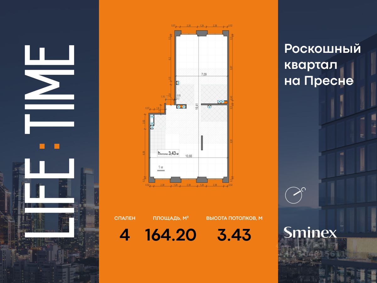 Просторная светлая квартира на две стороны площадью 164,2 кв. м. Оптимальное расположение трёх спален. Из окон кухни-гостиной (52,4 кв. м) открывается вид на панораму города, на высотки в стиле сталинского ампира. Две детские ориентированы в тихий приватный двор-парк с ландшафтным дизайном. В квартире все окна большие, широкие, с возможностью открывания настежь, что дополнительно улучшает видовые характеристики квартиры. Продуманная планировка позволяет разместить три мастер-спальни с отдельными санузлами и гардеробными. Life Time - роскошный современный квартал на Пресне, в наиболее быстро растущем премиальном районе ЦАО. Его насыщенная инфраструктура и выгодное расположение дарят время для жизни. Вы больше не тратите его на дорогу или ожидание, при этом ни в чём себе не отказывая. На территории предусмотрено всё для комфортной жизни: • двор-парк площадью 1,8 гектара с прудом и фонтанами, • Clubhouse - инфраструктурный центр в отдельном здании с исчерпывающими возможностями для спорта, отдыха и досуга только для жителей, • спортивная инфраструктура на улице и в помещении, в том числе бассейн длиной 25 метров, хот-таб, хаммам, сауна, бьюти-зона, • клубная гостиная с террасой, • всё для развития и досуга детей любого возраста, в том числе детский сад и школа. Life Time находится в центре сложившегося премиального района, в окружении многочисленных парков. Удобная транспортная доступность и прямой выезд на Звенигородское шоссе позволяют без проблем добраться до Садового кольца и Москва-Сити. Архитектурный стиль квартала - роскошный минимализм. Дома десятилетиями будут выглядеть современно.
