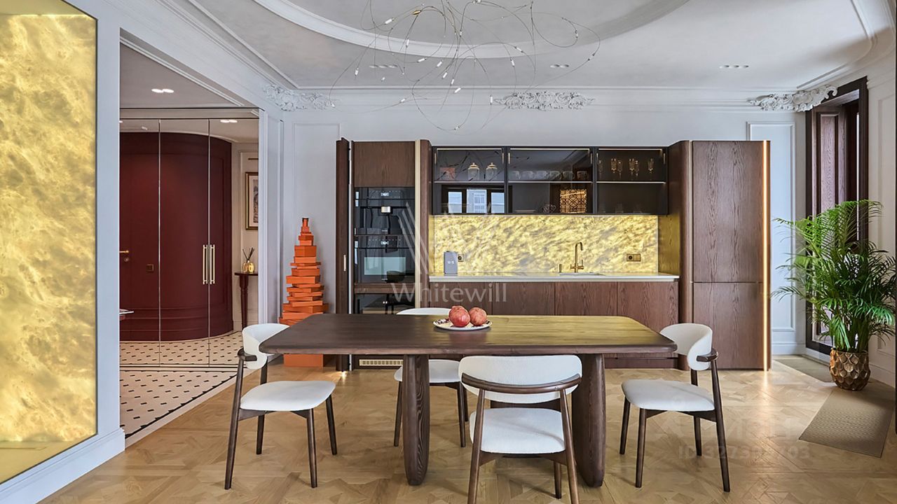 Видовые апартаменты в комплексе бизнес-класса ''Стремянный 2''. Интерьер оформлен по проекту архитектурного бюро, опубликован в международном журнале по дизайну. В холле на полу выложена французская плитка, бордовые стены украшает декоративное панно Hermes. Кухня с техникой Miele выполнена на заказ, полностью в шпоне шоколадного оттенка и в натуральном камне с архитектурной подсветкой. Обеденный стол изготовлен на заказ из массива дерева. В гостиной мраморный каминный портал с электрокамином и антикварным французским зеркалом, диванная группа Camaleonda, кушетка Le Corbusier, ковёр из овчины. В спальне большая метализированная кровать, зеркальная стена, на потолке фреска с мотивами панно Hermes и 4K-проектор. Большая гардеробная выполнена из лакированного шпона ореха. В ванной комнате натуральный мрамор, просторная душевая со смарт-стеклом. По всей квартире установлены системы увлажнения воздуха с климат-контролем, системы фильтрации воды, тёплые полы, ''умный дом'' с управлением через Алису. Функциональная планировка включает просторную кухню-гостиную с обеденной и тв-зоной с телевизором Samsung The Frame 75, спальню со своей гардеробной и санузлом, гостевой санузел и холл. Шесть панорамных окон в пол в рамах из натурального дерева наполняют пространство естественным светом и воздухом, открывая захватывающие виды на Церковь Флора и Лавра на Зацепе. Для жильцов комплекса предусмотрены машино-места в подземном паркинге. Главное о доме. Архитектура бюро SPEECH с клинкерной плиткой и тёмным камнем создаёт сдержанный фасад в самом сердце Замоскворечья. Вас встречает лобби с медными акцентами и бархатными креслами, где приветливый консьерж решит любые бытовые вопросы и поможет организовать досуг на вечер. Система ''Умный дом'' сама открывает ворота парковки для вашей машине и сообщает о визите гостей. ''Стремянный, 2'' — это технологичный клубный дом, где тишина и приватность сочетаются с энергичным ритмом Павелецкого района. Главное о локации. Вы живёте у главных транспортных ворот столицы. Из окна виден Павелецкий вокзал, откуда за 45 минут вы доезжаете на аэроэкспрессе до аэропорта Домодедово и отправляетесь в отпуск на море или в горе. Вечером вы идёте на концерт в Дом музыки или ужинаете в ресторане на Пятницкой — оба маршрута займут 15 минут пешком. Утром за продуктами заходите в EUROSPAR Express, чтобы приготовить вкусный ужин. Ваши дети учатся в рейтинговой школе 1259. Через 2 минуты на машине вы на Садовом кольце, а через 20 гуляете по зелёным аллеям парка Горького и покупаете ребёнку сладкую вату. Комментарий эксперта. Меня зовут Татьяна Зубова — брокер компании Whitewill. Я отвечаю за продажу этого лота. Свяжитесь со мной, чтобы получить расширенную презентацию, больше фотографий или договориться о просмотре. Могу провести экскурсию по локации и познакомить вас с этим домом. ID 323 860.