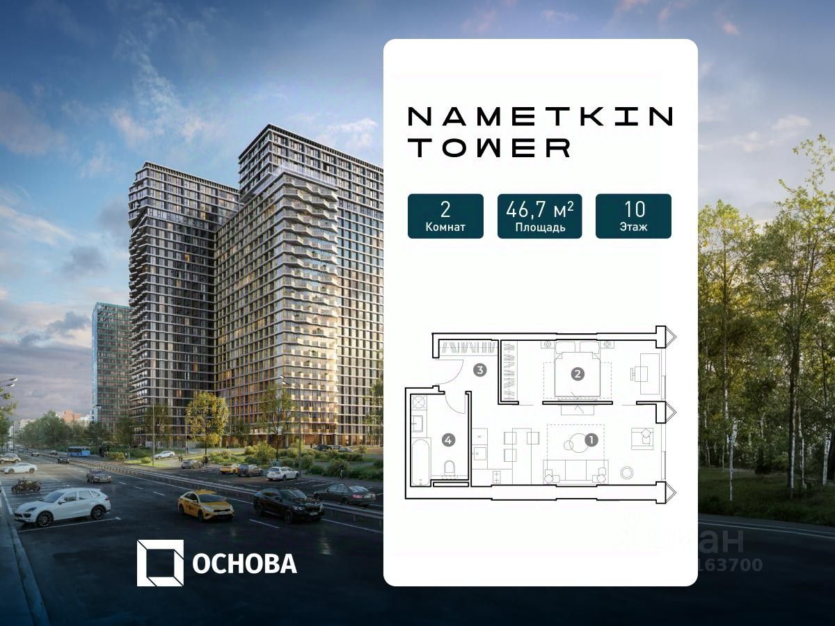Этот лот вы можете приобрести с ПВ всего 30% в рассрочку под 0%. Продаются 2-к апартаменты площадью 46.7 кв.м. на 10-м этаже 29 этажного дома в ''NAMETKIN TOWER'' от ГК ОСНОВА. Есть возможность приобретения лотов с отделкой white box. Nametkin Tower с двухуровневым подземным паркингом и обширной инфраструктурой будет построен в районе Черемушки по адресу: ул. Намёткина, вл. 10, рядом с Битцевским лесопарком и Воронцовским парком. Архитектура от известного бюро Mecanoo из Нидерландов. Новый комплекс на Наметкина, 10 включает 4 секции переменной этажности 24-29 этажей, двухуровневый подземный паркинг. В каждой секции запроектированы лобби с мягкими рекреационными зонами, консьерж-сервисом 24/7, колясочными, комнатами для матери и ребенка и гостевыми санузлами. На 25 этаже расположится досуговая зона на открытом воздухе с выходом на тематические площадки. К услугам резидентов Nametkin Tower будет предоставлена максимально насыщенная внутренняя инфраструктура: ресторан, супермаркет, спортивный центр, зал для проведения мероприятий, теннисные и бильярдные столы, коворкинг, Sky Bar, а также собственный медицинский центр и SPA. Дополнением станет благоустройство по авторской концепции Mecanoo, разделенное на два пространства: общественное вдоль улицы Намёткина, где будут располагаться входы в ресторан и магазины, а также приватное дворовое пространство, выполненное в концепции ''''двор без машин''''. В основе проектирования всех лотов лежит принцип оптимальной эргономики пространства и большая площадь остекления с высотой оконных проемов 2,7 м.