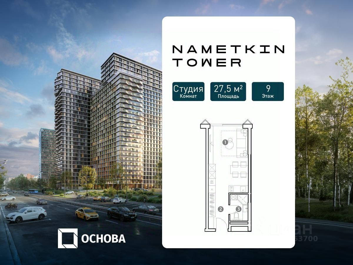 Этот лот вы можете приобрести с ПВ всего 30% в рассрочку под 0%. Продается студия площадью 27.5 кв.м. на 9-м этаже 29 этажного дома в ''NAMETKIN TOWER'' от ГК ОСНОВА. Есть возможность приобретения лотов с отделкой white box. Nametkin Tower с двухуровневым подземным паркингом и обширной инфраструктурой будет построен в районе Черемушки по адресу: ул. Намёткина, вл. 10, рядом с Битцевским лесопарком и Воронцовским парком. Архитектура от известного бюро Mecanoo из Нидерландов. Новый комплекс на Наметкина, 10 включает 4 секции переменной этажности 24-29 этажей, двухуровневый подземный паркинг. В каждой секции запроектированы лобби с мягкими рекреационными зонами, консьерж-сервисом 24/7, колясочными, комнатами для матери и ребенка и гостевыми санузлами. На 25 этаже расположится досуговая зона на открытом воздухе с выходом на тематические площадки. К услугам резидентов Nametkin Tower будет предоставлена максимально насыщенная внутренняя инфраструктура: ресторан, супермаркет, спортивный центр, зал для проведения мероприятий, теннисные и бильярдные столы, коворкинг, Sky Bar, а также собственный медицинский центр и SPA. Дополнением станет благоустройство по авторской концепции Mecanoo, разделенное на два пространства: общественное вдоль улицы Намёткина, где будут располагаться входы в ресторан и магазины, а также приватное дворовое пространство, выполненное в концепции ''''двор без машин''''. В основе проектирования всех лотов лежит принцип оптимальной эргономики пространства и большая площадь остекления с высотой оконных проемов 2,7 м. Есть возможность приобретения лотов с отделкой white box. Nametkin Tower с двухуровневым подземным паркингом и обширной инфраструктурой будет построен в районе Черемушки по адресу: ул. Намёткина, вл. 10, рядом с Битцевским лесопарком и Воронцовским парком. Архитектура от известного бюро Mecanoo из Нидерландов. Новый комплекс на Наметкина, 10 включает 4 секции переменной этажности 24-29 этажей, двухуровневый подземный паркинг. В каждой секции запроектированы лобби с мягкими рекреационными зонами, консьерж-сервисом 24/7, колясочными, комнатами для матери и ребенка и гостевыми санузлами. На 25 этаже расположится досуговая зона на открытом воздухе с выходом на тематические площадки. К услугам резидентов Nametkin Tower будет предоставлена максимально насыщенная внутренняя инфраструктура: ресторан, супермаркет, спортивный центр, зал для проведения мероприятий, теннисные и бильярдные столы, коворкинг, Sky Bar, а также собственный медицинский центр и SPA. Дополнением станет благоустройство по авторской концепции Mecanoo, разделенное на два пространства: общественное вдоль улицы Намёткина, где будут располагаться входы в ресторан и магазины, а также приватное дворовое пространство, выполненное в концепции ''''двор без машин''''. В основе проектирования всех лотов лежит принцип оптимальной эргономики пространства и большая площадь остекления с высотой оконных проемов 2,7 м.
