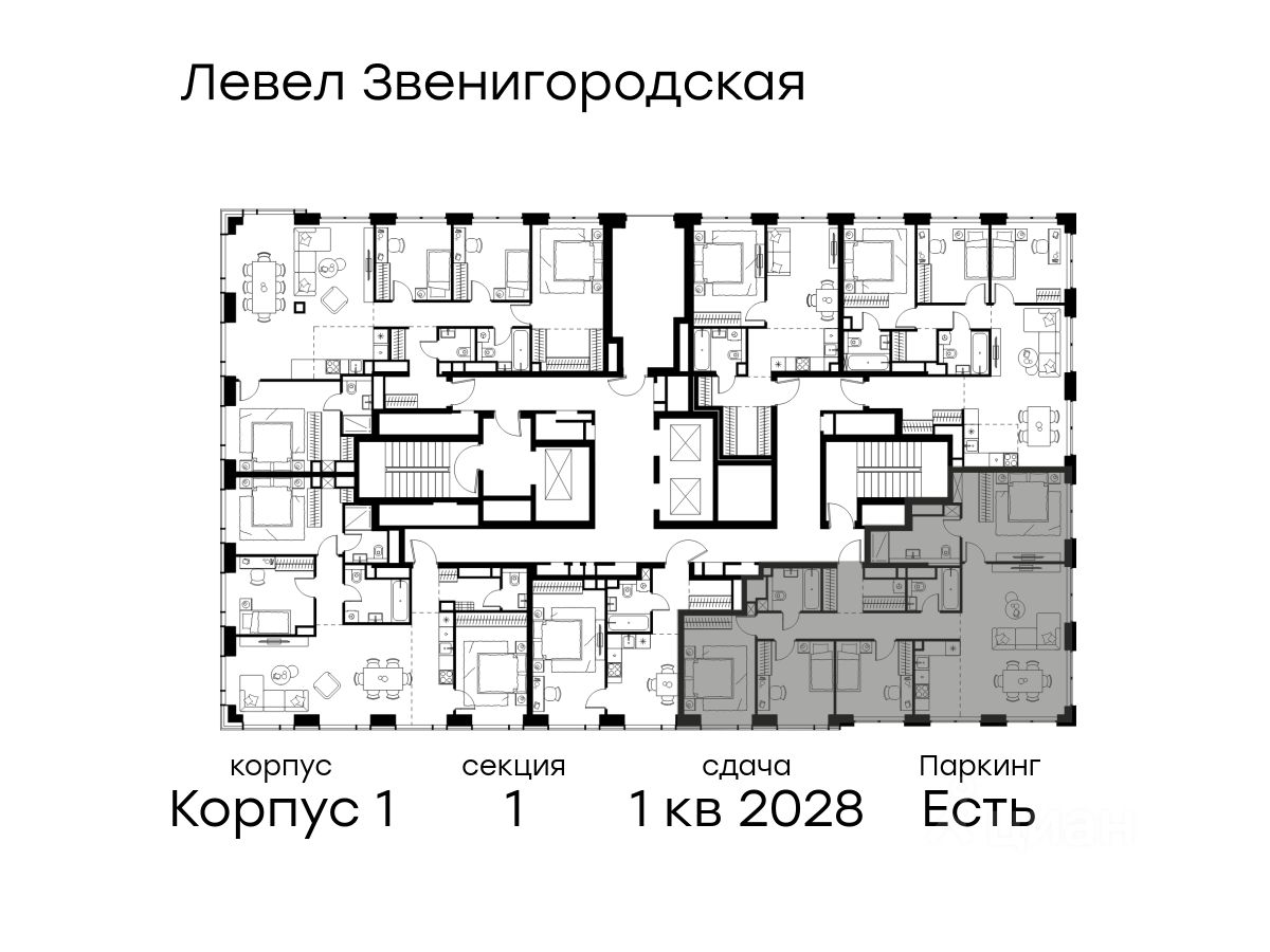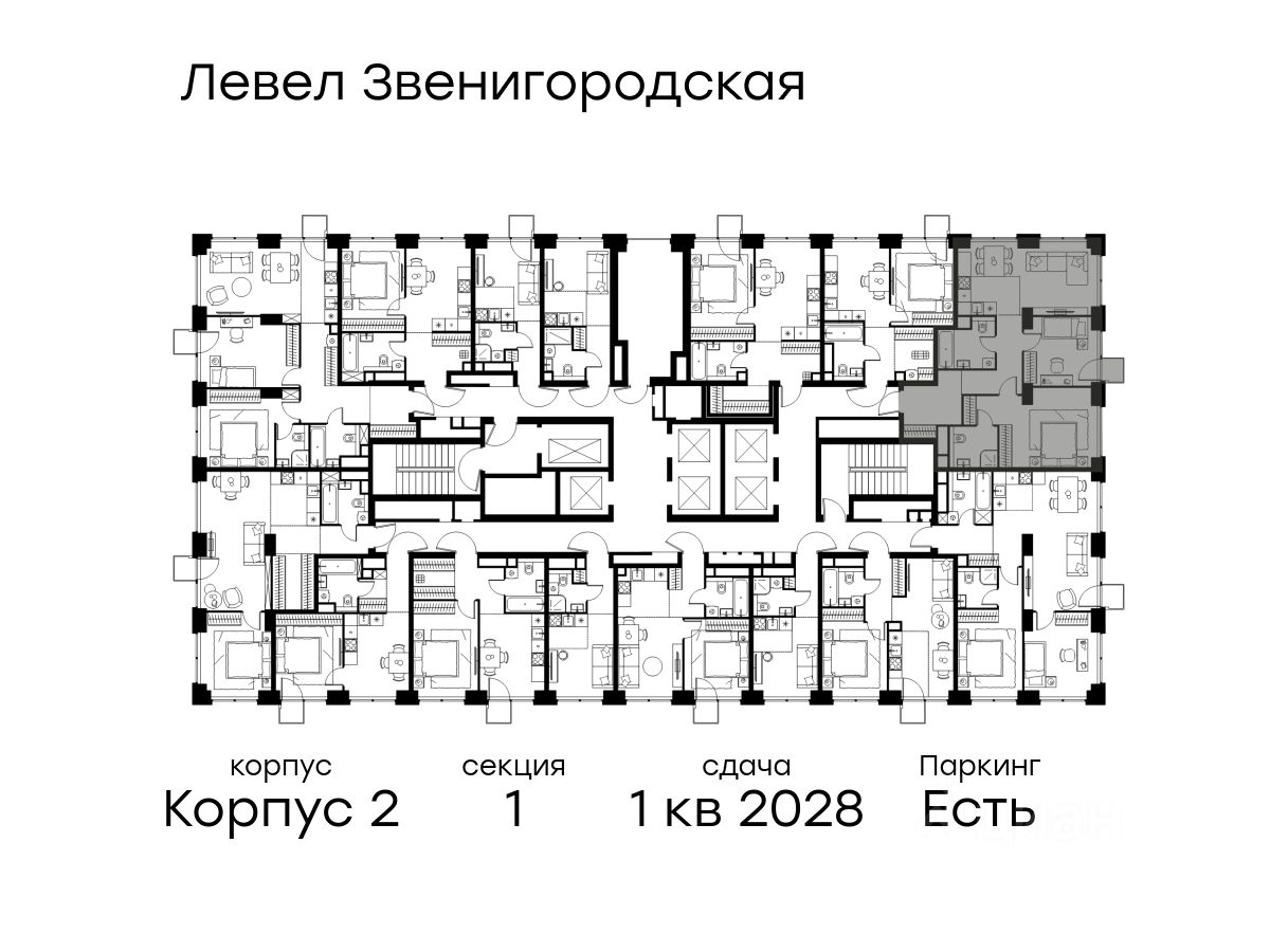 Цена указана с учётом скидки при 100%-й оплате, несубсидированной ипотеке, рассрочке (кроме программы ''Рассрочка 0%''). В жилом квартале продаётся 4-комнатная квартира площадью 78.80 кв.м white box. Квартира расположена на 42 этаже 48 этажного корпуса 1 в жилом комплексе комфорт класса Левел Звенигородская (компания Level Group/Левел групп). Отличная транспортная доступность - 5 мин. пешком до метро ''Звенигородская'' (откроется к окончанию строительства), - 18 мин. пешком до станции МЦК ''Хорошёво'' и станции БКЛ ''Народное ополчение'', - 4 мин. на авто до ТТК, - 8 мин. на авто до Садового кольца, - 15 мин. на авто до Кремля. Продуманный архитектурный проект - Концепция от студии Станислава Михаловского, в основу которой легло единение природы и города, - Двухкамерные стеклопакеты в окнах, алюминиевый и ПВХ профиль - в квартирах тепло зимой и прохладно летом, - С верхних этажей откроются панорамные виды на город, Москву-реку, ''Москва-Сити'' и Москворецкий парк, - Лобби со всеми удобствами: окна в пол, высокие потолки до 4,7 м, лаунж-зоны, колясочные, гостевые санузлы и мойки для лап животных, - Централизованные водонагреватели гарантируют круглогодичную подачу горячей воды в каждую квартиру. Благоустройство Концепция благоустройства разработана совместно с бюро UNK landscape. Высота башен приближается к 200 метрам - они словно касаются неба. Небесный простор проецируется на территорию двора с помощью подсветки, визуально увеличивая пространство и отражаясь в авторских элементах архитектуры. На территории площадью 0,45 га расположатся: - ''Облако событий'' - место встреч и общения, - ''Облако спорта'' - всё для поддержания себя в форме, - ''Облако принятия решений'' - пространство для работы на свежем воздухе, - ''Облако спокойствия'' - для отдыха в тишине природы, - ''Облако игр'' - площадки для подростков и самых маленьких. Инфраструктура В жилом комплексе откроется 21 коммерческое помещение: продуктовые лавки, кафе, салоны красоты, службы доставки и творческие студии. Этап 1 включает строительство двухуровневого подземного паркинга. Всего здесь расположится 351 машино-место, включая семейные места, и 264 кладовых помещения. В распоряжении жителей развитая инфраструктура района: 15 супермаркетов, 5 спортивных объектов, 9 медучреждений, 7 детских садов, 4 школы, 3 благоустроенных парка - всё в шаговой доступности. Инженерия Комфортное перемещение внутри домов будут обеспечивать надёжные лифты с доступом в паркинг с жилых этажей. В каждом корпусе предусмотрено до шести кабин, включая сервисные лифты. Попасть на территорию комплекса можно только по единому ключу доступа. Видеонаблюдение установлено на входах в подъезды, в лобби, в общих зонах, на въезде в паркинг. Гости смогут связаться с жителями дома через входные видеопанели, а управлять доступом на территорию можно через видеодомофон или приложение на телефоне.