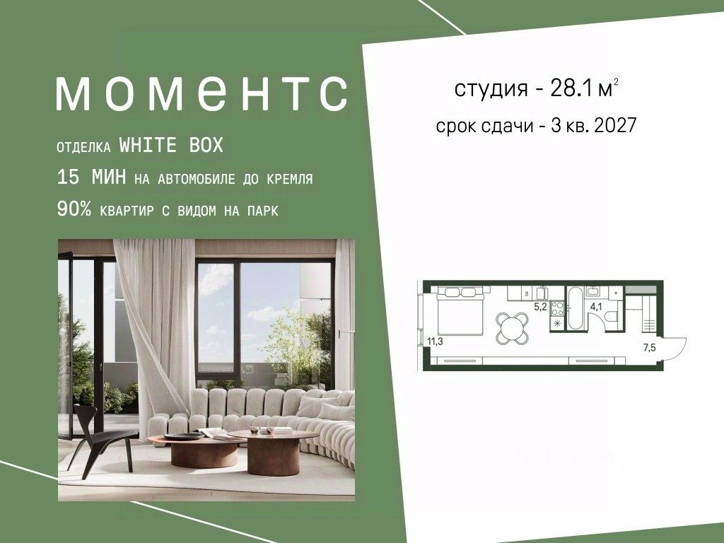 Цены указаны с условием 100% оплаты и стандартной ипотеки. Продается студия номер 113 общей площадью 28.1 кв.м. на 9-м этаже 30 этажного дома, корпус 2.1. С отделкой White Box. МОМЕНТС — ЖК бизнес-класса, расположен на расстоянии вытянутой руки от старинного усадебного парка Покровское-Стрешнево. МОМЕНТС — это единение города и природы, дом, который помогает обрести гармонию и баланс в жизни. МОМЕНТС расположен на Волоколамском шоссе с удобным выездом в центр и в область, а также с расположенными в пешей доступности объектами транспортной инфраструктуры (МЦК и МЦД-2). Жилой комплекс будет состоять из 3 очередей — 8 корпусов высотой от 4 до 47 этажей. Здания будут расположены под разными углами для максимальной открытости солнцу и максимально роскошным видовым характеристикам. Внутренний двор: Иммерсивное благоустройство от британского бюро Gillespies и West8 сфокусировано на эмоциональном и чувственном опыте. Каждая прогулка по Moments погружает в путешествие со сменой сценариев и плавным потоком уникальных моментов. - Пешеходная экотропа,которая соединяет комплекс с парком Покровское-Стрешнево - Двор с фонтаном - Зеленые сады и лаунж-зоны - Пространства для пикников и общения - Зоны активного отдыха. Детские и спортивные площадки - Пешеходные тропы и велодорожки - Разнообразная коммерческая инфраструктура - Детский сад на 175 мест - Школа на 300 мест - Игровые площадки из натуральных материалов - Сенсорные сады - Безбарьерное зонирование