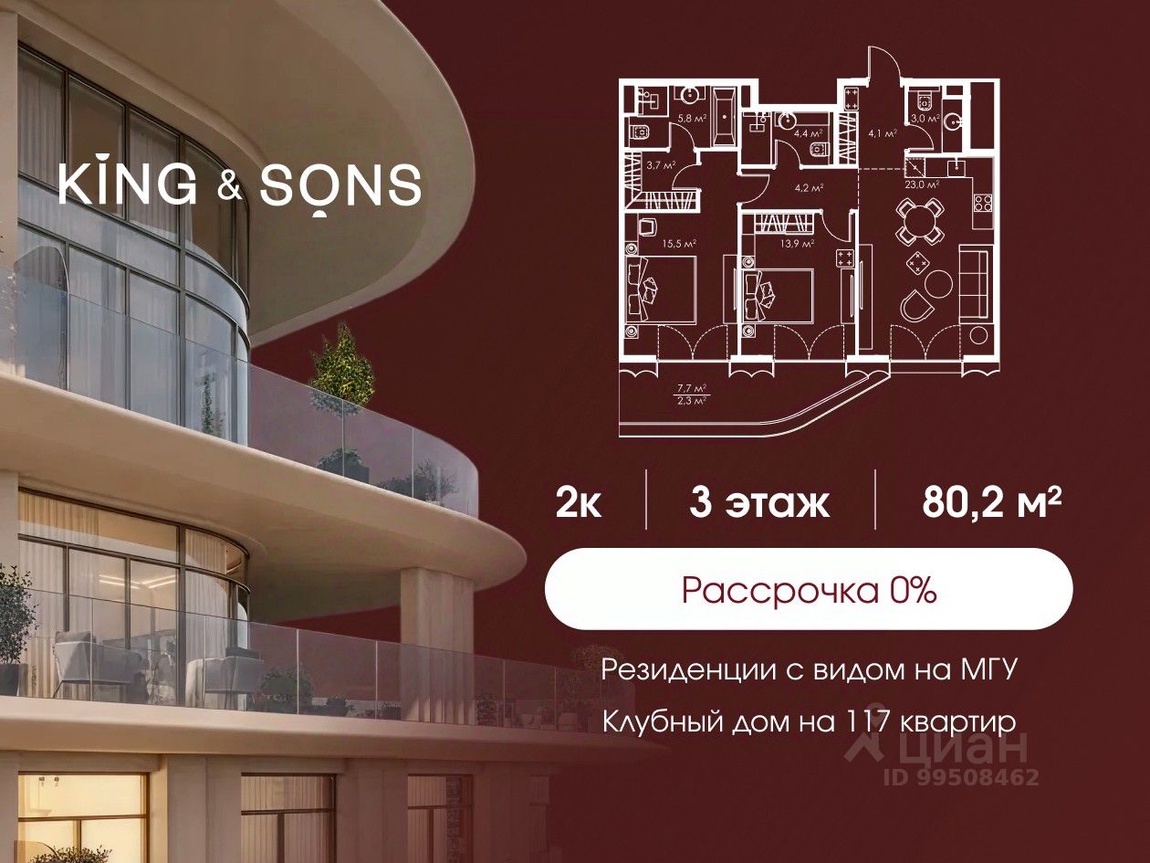 KING & SONS это клубный дом на 117 резиденций премиум-класса, расположенный на престижной и исторической улице Мосфильмовская. Из большинства квартир открываются панорамные виды на МГУ, ''Москву-Сити'', особняки посольств и парки. Это место для тех, кто не хочет выбирать между комфортом мегаполиса и уединением на природе. Проект разработан международным архитектурным бюро, которое входит в ТОП-2 в мире. Фасады из натурального камня, мягкие формы здания, максимально открытое остекление, окна в пол — все это делает облик здания выразительным и уникальным. В проекте предусмотрено 70% квартир с террасами. Потолки от 3,2 до 4,7 м. Паркинг на 110 машиномест. Для будущих резидентов продуманы разнообразные общественные пространства зимний сад в лобби первого этажа, секретный сад с зоной открытого огня, лаундж-зона с кинотеатром на крыше, собственный спортзал, зоны для занятий йогой и медитацией. KING & SONS это фамильная недвижимость, которую с гордостью передают по наследству