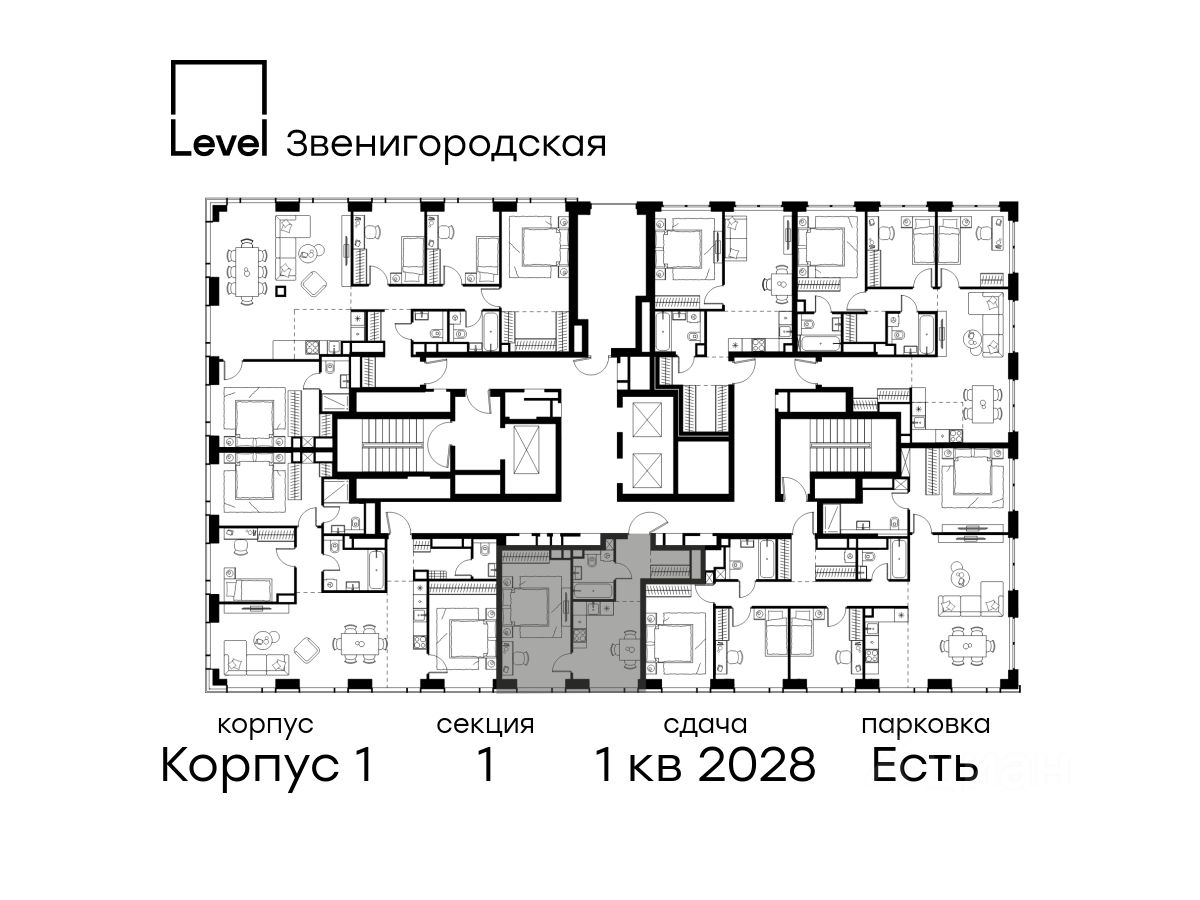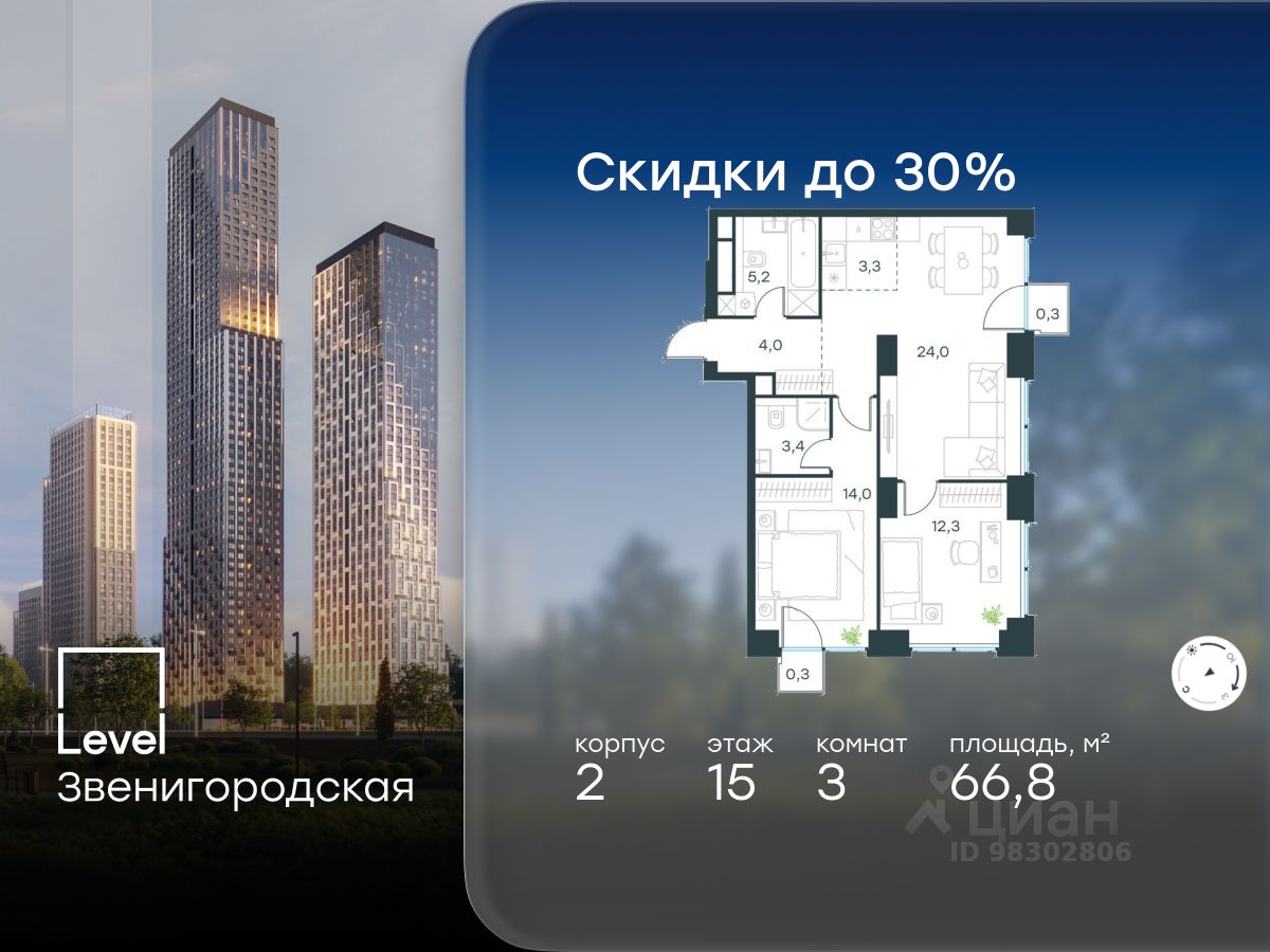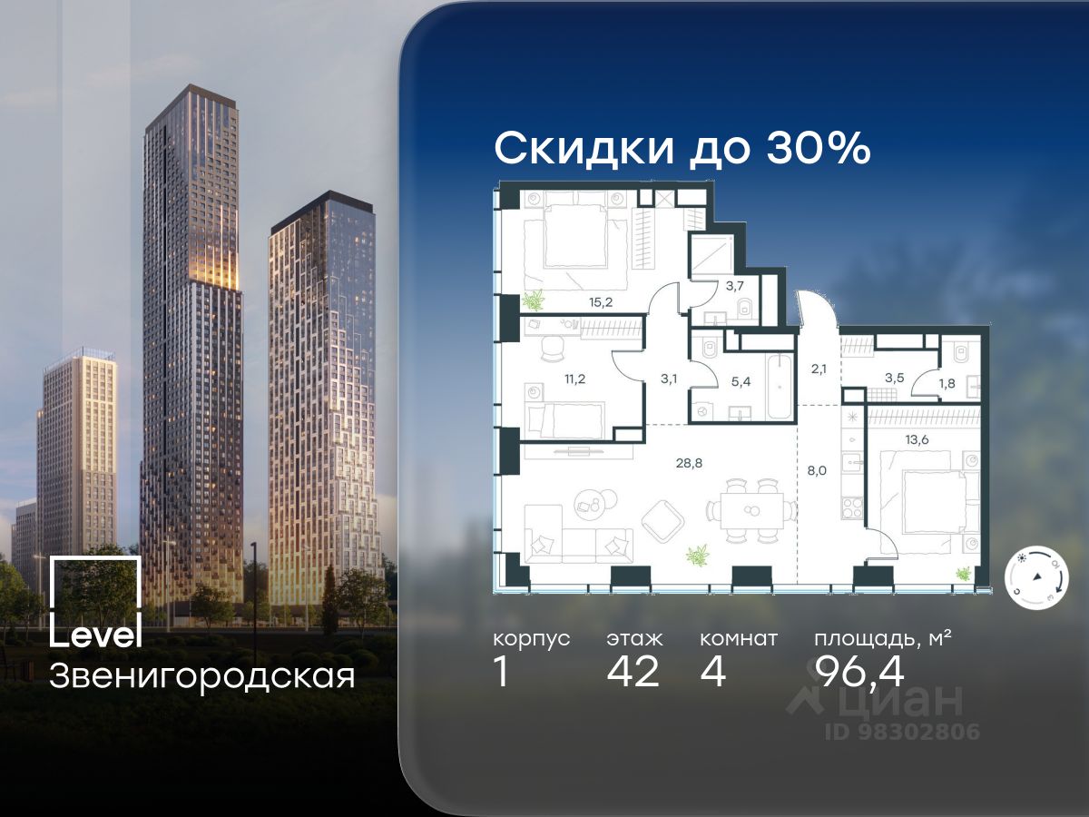 Цена указана с учётом скидки при 100%-й оплате, несубсидированной ипотеке, рассрочке (кроме программы ''Рассрочка 0%''). В жилом квартале продаётся 4-комнатная квартира площадью 99.10 кв.м white box. Квартира расположена на 28 этаже 48 этажного корпуса 1 в жилом комплексе комфорт класса Level Звенигородская (компания Level Group/Левел групп). Отличная транспортная доступность - 5 мин. пешком до метро ''Звенигородская'' (откроется к окончанию строительства), - 18 мин. пешком до станции МЦК ''Хорошёво'' и станции БКЛ ''Народное ополчение'', - 4 мин. на авто до ТТК, - 8 мин. на авто до Садового кольца, - 15 мин. на авто до Кремля. Продуманный архитектурный проект - Концепция от студии Станислава Михаловского, в основу которой легло единение природы и города, - Двухкамерные стеклопакеты в окнах, алюминиевый и ПВХ профиль - в квартирах тепло зимой и прохладно летом, - С верхних этажей откроются панорамные виды на город, Москву-реку, ''Москва-Сити'' и Москворецкий парк, - Лобби со всеми удобствами: окна в пол, высокие потолки до 4,7 м, лаунж-зоны, колясочные, гостевые санузлы и мойки для лап животных, - Централизованные водонагреватели гарантируют круглогодичную подачу горячей воды в каждую квартиру. Благоустройство Концепция благоустройства разработана совместно с бюро UNK landscape. Высота башен приближается к 200 метрам - они словно касаются неба. Небесный простор проецируется на территорию двора с помощью подсветки, визуально увеличивая пространство и отражаясь в авторских элементах архитектуры. На территории площадью 0,45 га расположатся: - ''Облако событий'' - место встреч и общения, - ''Облако спорта'' - всё для поддержания себя в форме, - ''Облако принятия решений'' - пространство для работы на свежем воздухе, - ''Облако спокойствия'' - для отдыха в тишине природы, - ''Облако игр'' - площадки для подростков и самых маленьких. Инфраструктура В жилом комплексе откроется 21 коммерческое помещение: продуктовые лавки, кафе, салоны красоты, службы доставки и творческие студии. Этап 1 включает строительство двухуровневого подземного паркинга. Всего здесь расположится 351 машино-место, включая семейные места, и 264 кладовых помещения. В распоряжении жителей развитая инфраструктура района: 15 супермаркетов, 5 спортивных объектов, 9 медучреждений, 7 детских садов, 4 школы, 3 благоустроенных парка - всё в шаговой доступности. Инженерия Комфортное перемещение внутри домов будут обеспечивать надёжные лифты с доступом в паркинг с жилых этажей. В каждом корпусе предусмотрено до шести кабин, включая сервисные лифты. Попасть на территорию комплекса можно только по единому ключу доступа. Видеонаблюдение установлено на входах в подъезды, в лобби, в общих зонах, на въезде в паркинг. Гости смогут связаться с жителями дома через входные видеопанели, а управлять доступом на территорию можно через видеодомофон или приложение на телефоне.