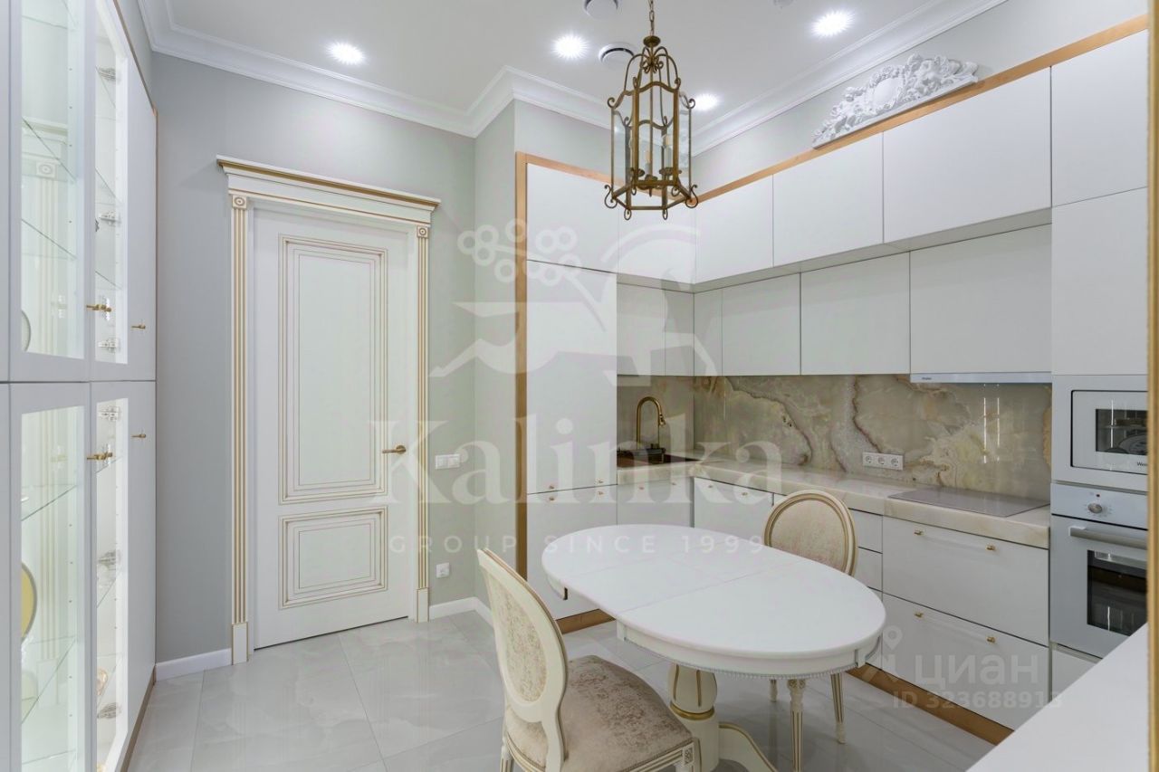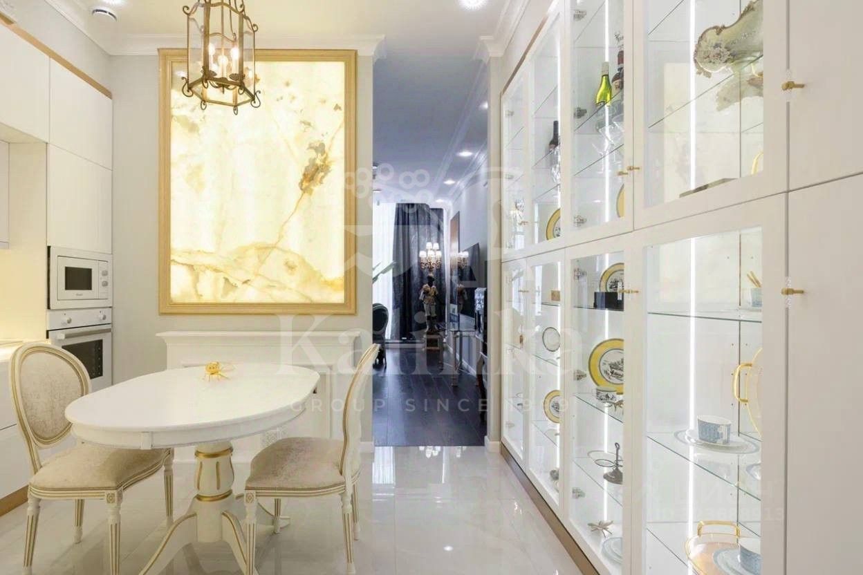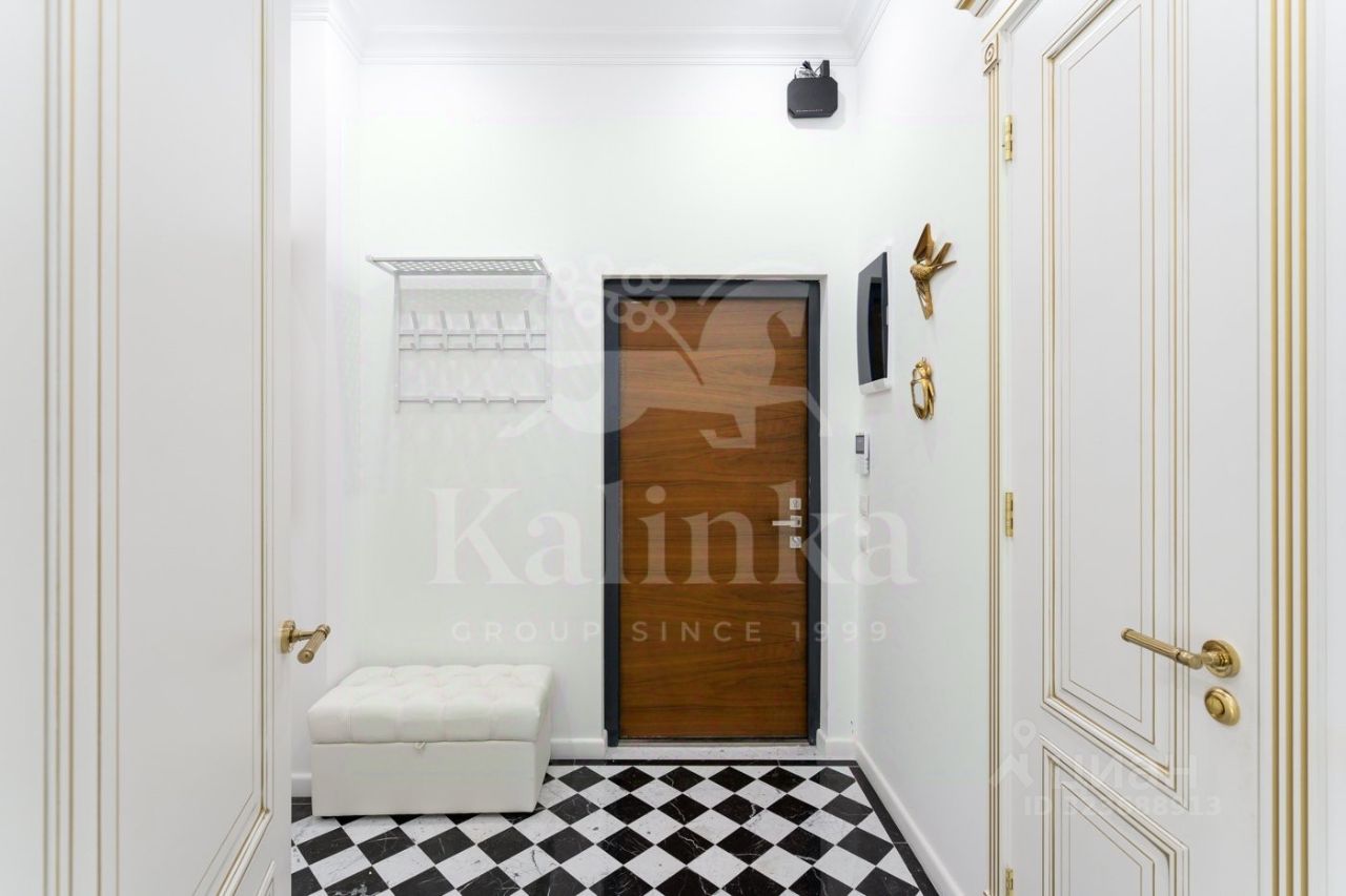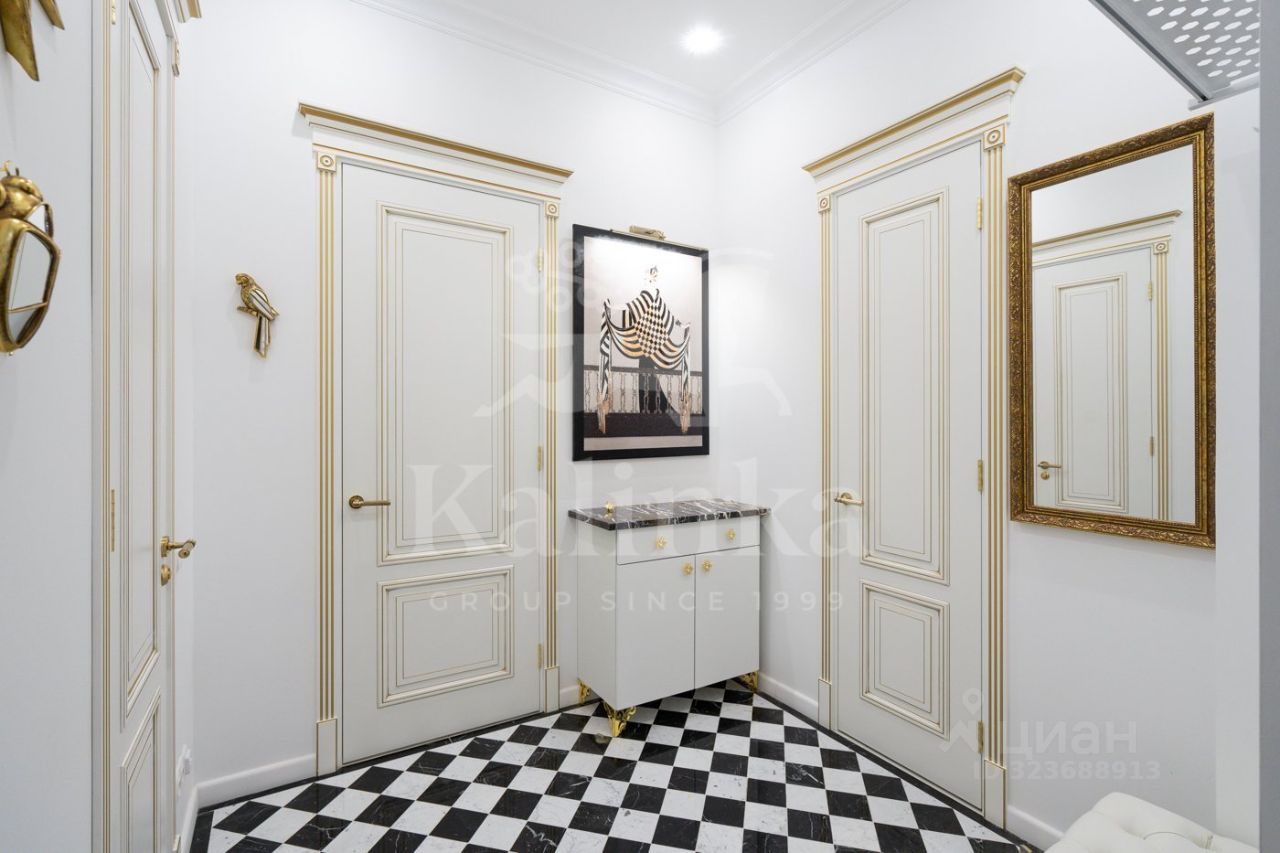 Просторная квартира с 3-мя спальнями общей площадью 287 м² в особняке ''Пречистенка 13'' в Хамовниках. Квартира с дизайнерским ремонтом расположена на 5-м этаже в корпусе 1. Выполнена отделка в стиле неоклассики с использованием высококачественных материалов — премиальная керамическая плитка, мрамор, паркет из ценных пород. Высота потолков 3,8 метра. Квартира полностью меблирована и укомплектована бытовой техникой. Все элементы декора, люстры и светильники подобраны по индивидуальному дизайн-проекту, дополнительным украшением интерьера служат колонны и расписные стены. Функциональная планировка: гостиная с выходом на балкон, кухня-столовая, мастер-спальня с собственной гардеробной и ванной, 2 спальни, 3 санузла, гардеробная, постирочная, холл. Благодаря большому количеству окон пространство наполнено светом, открываются панорамные виды на улицу Пречистенка, Лопухинский переулок и во внутренний двор. Описание комплекса ''Пречистенка 13'' — 8-этажный исторический особняк в стиле неоклассицизм, построен в 1912 по заказу владельца торгово-строительного акционерного общества Якова Рекка. В конце 80-х годов здание реконструировали, в 2014 году был возвращен исторический облик — полукруглый эркер со скульптурами, башенку с часами, внутреннюю отделку восстановили по архивным эскизам. На верхних этажах разместились трехуровневые пентхаусы с просторными террасами общей площадью 1 500 м², в каждой квартире есть возможность установить дровяной камин.