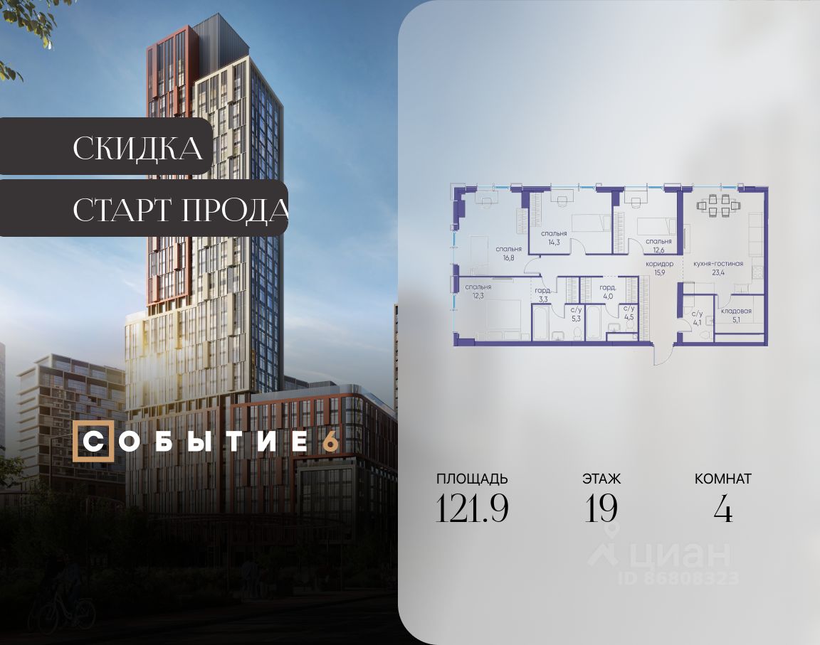 Скидка до 8% действует до 27.02.2026 г. при 100% оплате и не субсидированной ипотеке. Продаётся 4-комнатная квартира от застройщика: общая площадь 121.90 м², жилая 56.00 м², кухня 23.40 м², 19-й этаж, жилой квартал ''Событие-6'', корпус 2 (секция 5) Срок сдачи: 1 квартал 2029 года. Позвоните сейчас и забронируйте квартиру! Продуманный до деталей. Созданный для жизни, полной счастливых событий. Парк-квартал СОБЫТИЕ - это жизнь класса премиум в престижном районе на Мосфильмовской улице. Архитектура мирового уровня. Выигрышное расположение на границе природного комплекса ''Долина реки Раменки''. Все для комфортной жизни и досуга: от детсадов и школ до ресторанов и медцентров. И новая точка притяжения - уже готовый парк ''Событие'' с пространствами активности для всех возрастов и интересов. Особенности квартала: • ''Парящие'' мосты и парк под облаками - уникальный дом с самыми завораживающими видами из окон ''в пол'' • Собственный парк - сразу за порогом! • Архитектурная концепция от известных международных бюро LDA Design и UHA London • Инфраструктура ''тапочной доступности'': в кафе, школу, магазин - за пару минут! • Внутренний двор - настоящее продолжение вашего дома: закрытая охраняемая территория без машин, развивающие детские площадки, воркауты-зоны для тех, кто хочет быть в форме, площади для праздников и посиделок с соседями.