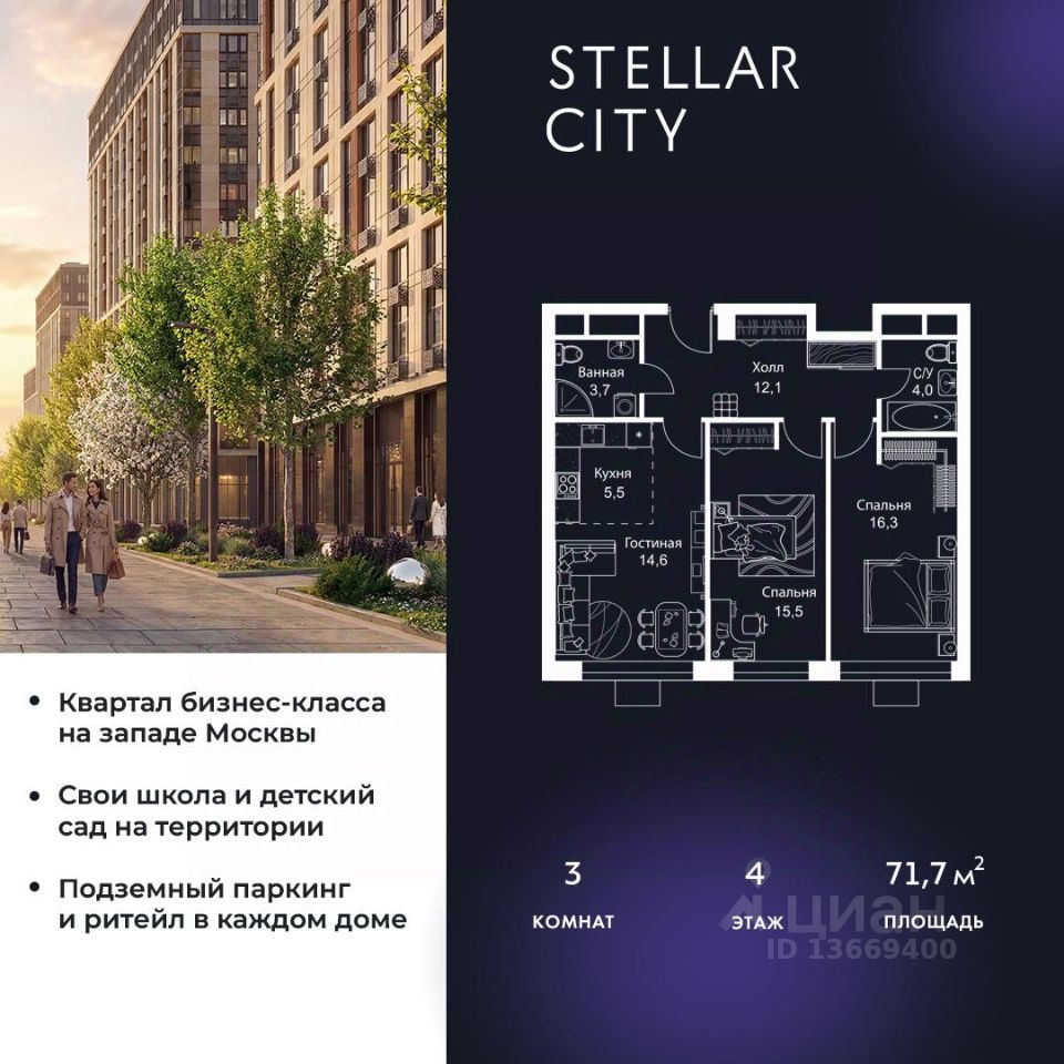 Продается квартира от надежного застройщика Tashir Estate в квартале бизнес-класса Stellar City в ЗАО Москвы. Площадь квартиры составляет: 71.7 кв. м, потолки: 3.1 м Квартира находится на 4 этаже, 4 корпуса жилого квартала Stellar City — микрогорода будущего на орбите Москвы. Stellar City — квартал в ЗАО Москвы вблизи инновационного центра Сколково. В окружении — 11 парков и природных зон, в том числе Долина реки Сетунь, Мещерский лес и парк развлечений The Rink. Город в городе Чтобы дом и инфраструктура вокруг отвечала динамичному лайфстайлу жителя мегаполиса, в основу проекта легла концепция город в городе, которая позволяет решать все бытовые вопросы in-home. В квартале будут возведены школа и детский сад, воркаут-зоны, променад, вело и беговые дорожки, детские площадки для каждого корпуса, а также коммерция на первых этажах для ежедневных покупок. Все необходимое — на расстоянии нескольких шагов. Изящные и лаконичные лобби Авторский дизайн, натуральные материалы в отделке и безупречный интерьер вне времени. Лобби и холлы в проекте бизнес-класса Stellar City ничем не отличаются от входных групп в премиум-сегменте благодаря качественным европейским материалам в отделке, стильному дизайну, консьерж-сервису и уютной зоне ожидания с журнальными столиками и мягкой мебелью. Комфорт и безопасность Закрытая территория, охрана, система СКУД, специально разработанное мобильное приложение дома для резидентов и подземный паркинг с круглосуточным наблюдением и доступом с помощью автоматического считывания номера авто.