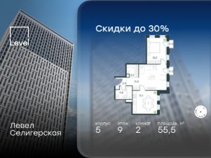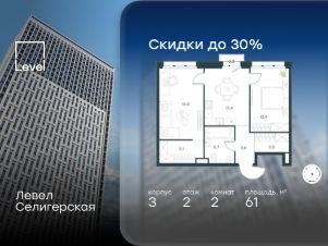 Цена указана с учётом скидки при 100%-й оплате, несубсидированной ипотеке, рассрочке (кроме программы ''Рассрочка 0%'').В жилом квартале, расположенном в южной части района Западное Дегунино, продаётся 2-комнатная квартира площадью 61.00 кв.м без отделки. Квартира расположена на 2 этаже 40-этажного корпуса 3 в жилом комплексе комфорт-класса Левел Селигерская (компания Level Group/Левел групп).Отличная транспортная доступность:- 10 мин. пешком до станции метро ''Верхние Лихоборы'',- 15 мин. пешком до станции метро ''Селигерская'',- 20 мин. пешком до станции МЦД-3 ''Моссельмаш'',- 11 мин. на авто до МКАД,- 13 мин. на авто до ТТК,- 16 мин. на авто до Садового кольца.РасположениеРайон отличается богатой социальной инфраструктурой: школы, детские сады, поликлиники, магазины, фитнес-клубы, торговые центры - всё близко к дому. Рядом с Левел Селигерская расположено 5 парковых зон. В 3 минутах от дома расположен перспективный сквер-парк. В 10 минутах пешком находится парк им. Святослава Фёдорова, в 13 минутах на велосипеде - парк ''Ангарские пруды''. В 7-11 минутах на автомобиле - два крупных природных объекта: Тимирязевский парк и Главный ботанический сад Российской академии наук.БлагоустройствоВнутренние дворы жилого комплекса огорожены от машин, а их функциональное наполнение отличается в зависимости от очереди строительства. На территории 2-й очереди жителей ждут уютные навесы с качелями, павильон-читальня, волейбольная площадка, беседки, а также детские и спортивные площадки.Технологии и инженерияДля входа на территорию комплекса предусмотрен единый ключ доступа. Все общественные зоны оснащены камерами видеонаблюдения, по заявке собственнику предоставляется возможность просмотра изображения отдельных видеокамер на его мобильном устройстве. При въезде в паркинг функционирует система распознавания госномеров. Кроме того, для комфорта жителей создано мобильное приложение, с помощью которого можно удаленно контролировать доступ на придомовую и жилую территории.Другие преимущества жилого комплекса- Высокая освещённость квартир: в большинстве из них не менее трёх окон,- Супермаркет, магазины, кафе, пекарни и многое другое на первых этажах домов,- Частный детский сад,- Стильные дизайнерские лобби с высокими потолками до 4,3 м. и окнами в пол, для питомцев предусмотрена лапомойка,- 30+ планировочных решений: от компактных студий до просторных семейных квартир,- С каждого этажа дома на лифте можно спуститься в подземный отапливаемый паркинг.''