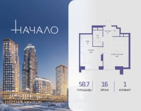 В престижном районе Пресня, на перекрестке делового и исторического центров Москвы, продается однокомнатная квартира площадью 58.70 кв. м без отделки. Квартира находится на 16 этаже 48-этажного дома, в новом элитном жилом комплексе ''Начало'' от девелопера ''Донстрой''. Реализация проекта запланирована на 1 квартал 2030 года.Начало - футуристический дом на Пресне в нескольких минутах от Сити и Садового кольца. Проект по-настоящему космического масштаба, где есть все, чтобы раскрыть себя и свои возможности. РасположениеПресня - один из самых престижных районов Москвы. Жить здесь - значит стать частью истории столицы, быть в эпицентре деловой активности города и ощущать, как сама Вселенная вращается вокруг вас.- 5 минут пешком до Красногвардейских прудов,- 15 минут пешком до ст. метро ''Улица 1905 года'',- 6 минут на автомобиле до Садового кольца и небоскрёбов ''Москва-Сити'',- 12 минут на автомобиле до Кремля.Архитектура как путешествиеКак росток пробивает скалу, как растет кристалл, как ракета устремляется ввысь - так формируется архитектурный образ этого дома. Точно выверенный баланс между футуристичными формами и функциональным содержанием дома выводит жизнь в нем на новую орбиту. Стеклянные фасады отражают небо и город, превращая здание в зеркало для окружающего ландшафта.Двор между небом и землёйПросторная территория двора с тремя тематическими зонами отдыха: ''Млечный путь'' - для детских игр и развлечений, ''Космический сад'' - для тихого отдыха и релакса, ''Метеоритный сад'' - для любителей спорта.Открытый променад - сквозной маршрут на крыше стилобата с зонами отдыха, занятий спортом, детских игр и совместной работы. Все площадки плавно связаны между собой прогулочной дорожкой.Теплая кольцевая галерея и мосты над пространством двора - все корпуса ''стыкуются'', точно модули космической станции.Главный центр притяженияВ составе проекта возводится собственный комьюнити-центр, где создана идеальная атмосфера для любых начинаний: - Детский клуб для будущих покорителей Вселенной,- Коворкинги для решения задач планетарного и космического масштабов,- Переговорные для судьбоносных и просто важных встреч,- Лаунжи с атмосферой дзена и релакса,- Библиотека для спокойного чтения,- Кинотеатр для классики и блокбастеров.Территория комфорта и приватностиВсё нужное рядом:- Современный образовательный центр со школой и детским садом - для ваших детей,- Фитнес-центр с бассейном - для релакса и борьбы со стрессом,- Ресторанная улица: кафе, рестораны, летние террасы - для деловых обедов и семейных ужинов,- Пекарня и минимаркет в доме - для ежедневных покупок,- Сквер у дома - для неспешных прогулок и спокойного отдыха,- Никаких такси на улице. Машина заберет вас прямо в подземном паркинге вашего корпуса.