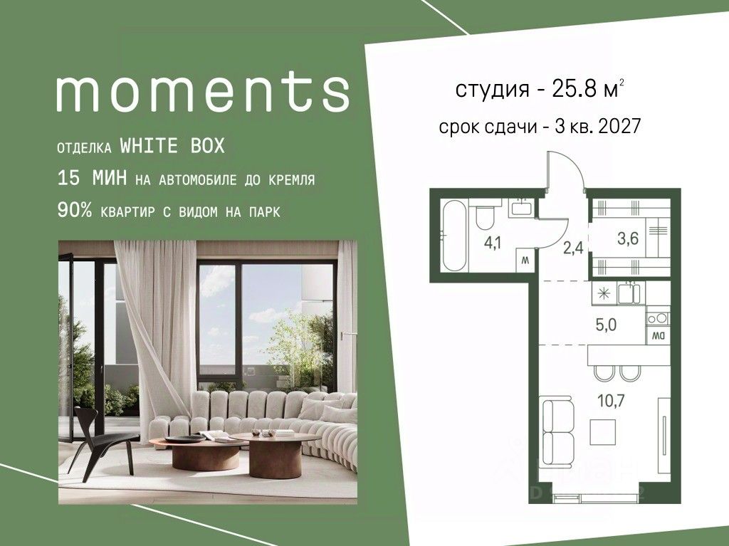 Цены указаны с условием 100% оплаты и стандартной ипотеки. Продается студия номер 907 общей площадью 25.8 кв.м. на 5-м этаже 34 этажного дома, корпус 2.2. С отделкой White Box. Moments — ЖК бизнес-класса, расположен на расстоянии вытянутой руки от старинного усадебного парка Покровское-Стрешнево. Moments — это единение города и природы, дом, который помогает обрести гармонию и баланс в жизни. Moments расположен на Волоколамском шоссе с удобным выездом в центр и в область, а также с расположенными в пешей доступности объектами транспортной инфраструктуры (МЦК и МЦД-2). Жилой комплекс будет состоять из 3 очередей — 8 корпусов высотой от 4 до 47 этажей. Здания будут расположены под разными углами для максимальной открытости солнцу и максимально роскошным видовым характеристикам. Внутренний двор: Иммерсивное благоустройство от британского бюро Gillespies и West8 сфокусировано на эмоциональном и чувственном опыте. Каждая прогулка по Moments погружает в путешествие со сменой сценариев и плавным потоком уникальных моментов. - Пешеходная экотропа,которая соединяет комплекс с парком Покровское-Стрешнево - Двор с фонтаном - Зеленые сады и лаунж-зоны - Пространства для пикников и общения - Зоны активного отдыха. Детские и спортивные площадки - Пешеходные тропы и велодорожки - Разнообразная коммерческая инфраструктура - Детский сад на 175 мест - Школа на 300 мест - Игровые площадки из натуральных материалов - Сенсорные сады - Безбарьерное зонирование