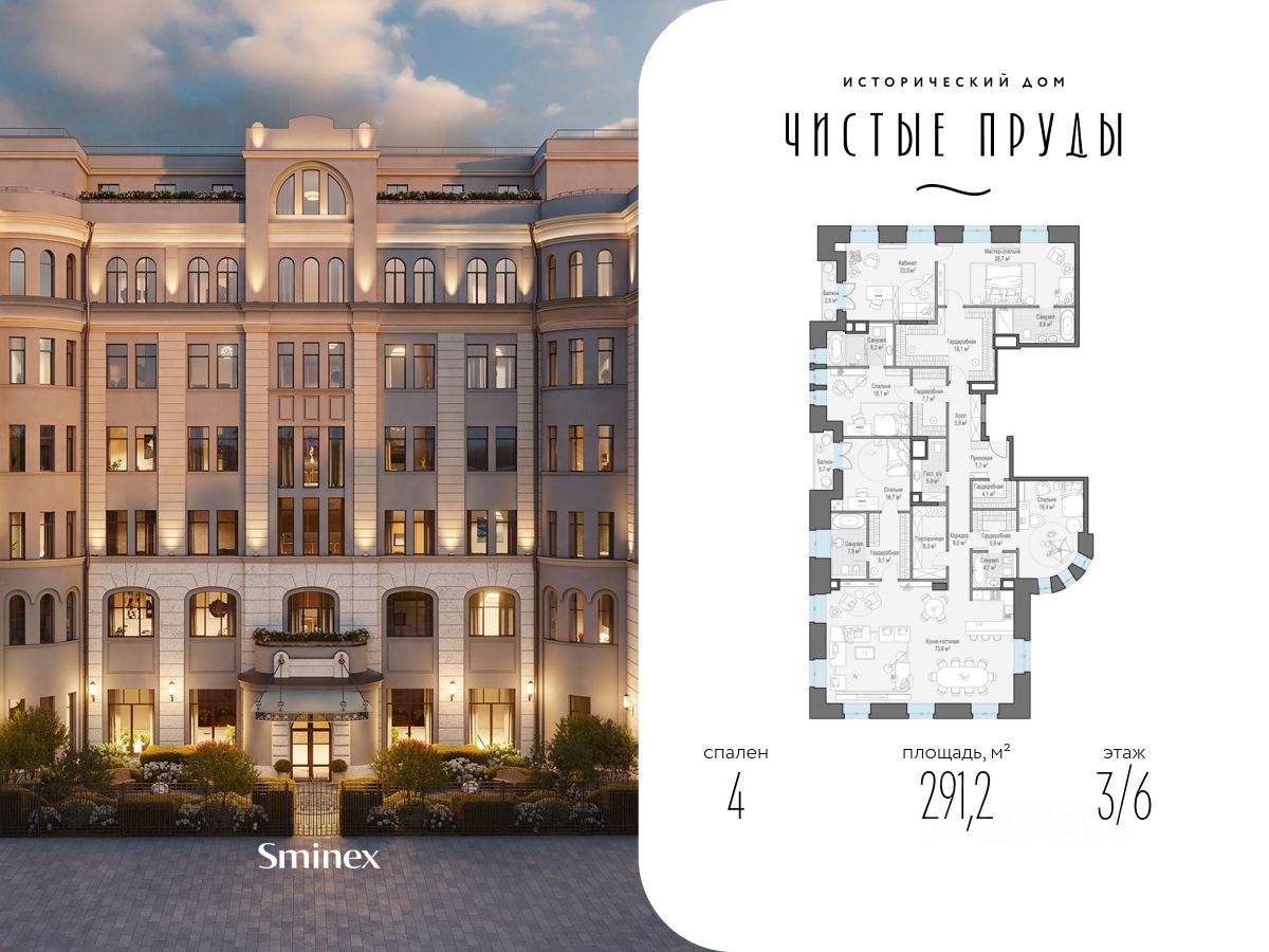 Роскошная квартира площадью 291,2 кв. м с потолками высотой 3,9 метра и видами на четыре стороны света. Продуманная планировка позволяет разместить четыре мастер-блока с отдельными гардеробными и санузлами, а также отдельный кабинет с элегантным полукруглым эркером. Окна в ванных комнатах дарят возможность зарядиться энергией первых лучей солнца. В просторной кухне-гостиной площадью 73,6 кв. м шесть больших окон, которые выходят в собственный двор-сад. Здесь вы можете разместить обеденную зону с видом на фонтаны. Атмосферу уюта дополнят два балкона с видом на Чистопрудный бульвар. ''Чистые Пруды'' - исторический дом на 34 квартиры в уникальном атмосферном районе Москвы, в 50 метрах от Чистых прудов. Это одно из самых романтичных и престижных мест столицы. Дом расположен в глубине квартала, в окружении тихих переулков - в полной тишине и приватности старого московского двора. ''Чистые Пруды'' - деликатно реконструированный исторический дом с изысканной архитектурой начала прошлого века авторства барона Отто фон Дессина. У дома максимально сохранены архитектурные формы 1915 года и подлинные кирпичные стены. В ''Чистых Прудах'' создана небывалая для таких домов инфраструктура. Только для жителей на месте каретного двора XIX века расположен Clubhouse с пространствами для общения соседей, здорового образа жизни и развития детей. В Lounge выделены каминная, патио, зона для проведения мастер-классов и настольных игр. Работает бесплатный фитнес по стандарту Fit Lab с зонами кардио, силовых тренажёров, свободных весов и функционального тренинга. Для детей в Clubhouse создана игровая комната по стандарту Kid's Lab. Есть свой всесезонный двор-сад. В доме представлены роскошные квартиры с дровяными каминами и высокими потолками от 3,9 до 5,4 м. О жителях и доме заботится Служба комфорта Smineх, которая предлагает сервис уровня 5-звёздочных отелей и сохраняет изначальный облик и концепцию дома. Девелопер проекта - Sminex. Компания обладает 23-летним опытом строительства жилой и коммерческой недвижимости. В 2022 году Sminex приобрёл девелопера ''Интеко'', в 2024 году - ''Инград''. Сегодня Sminex - девелопер N1 элитной и премиальной недвижимости, который создаёт комфортную и престижную среду.