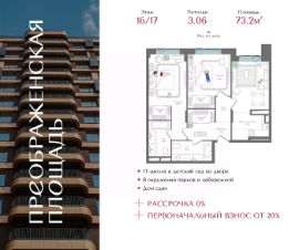 Рассрочка 0% с первоначальным взносом от 20%Квартира на 16 этаже в жилом комплексе премиум-класса ''Преображенская площадь''. Общая площадь: 73.2 кв.м.Проект премиум-класса в историческом районе Москвы. До метро ''Преображенская площадь'' 3 минуты пешком.Квартиры сдаются без отделки и в свободной планировке, чтобы жители могли оформить пространство с учетом своей индивидуальности. Высота потолков от 3,15м, широкоформатное остекление, 3-5 квартир на этаже. Система Умный дом. Дизайнерские лобби.Внутренний двор 1,5 га функциональное и безопасное пространство для игр, работы и занятий спортом. Пешеходный променад для прогулок. Дома переменной этажности. Есть подземный паркинг.Жилой комлекс находится в окружении парков Сокольники, Черкизовский, Измайловский, заповедника Лосиный остров и ВДНХ, а также вблизи пешеходной набережной.Комфортная удаленность от центра: 7 минут на автомобиле до ТТК, 8 минут до Садового кольца, 25 минут до Кремля.