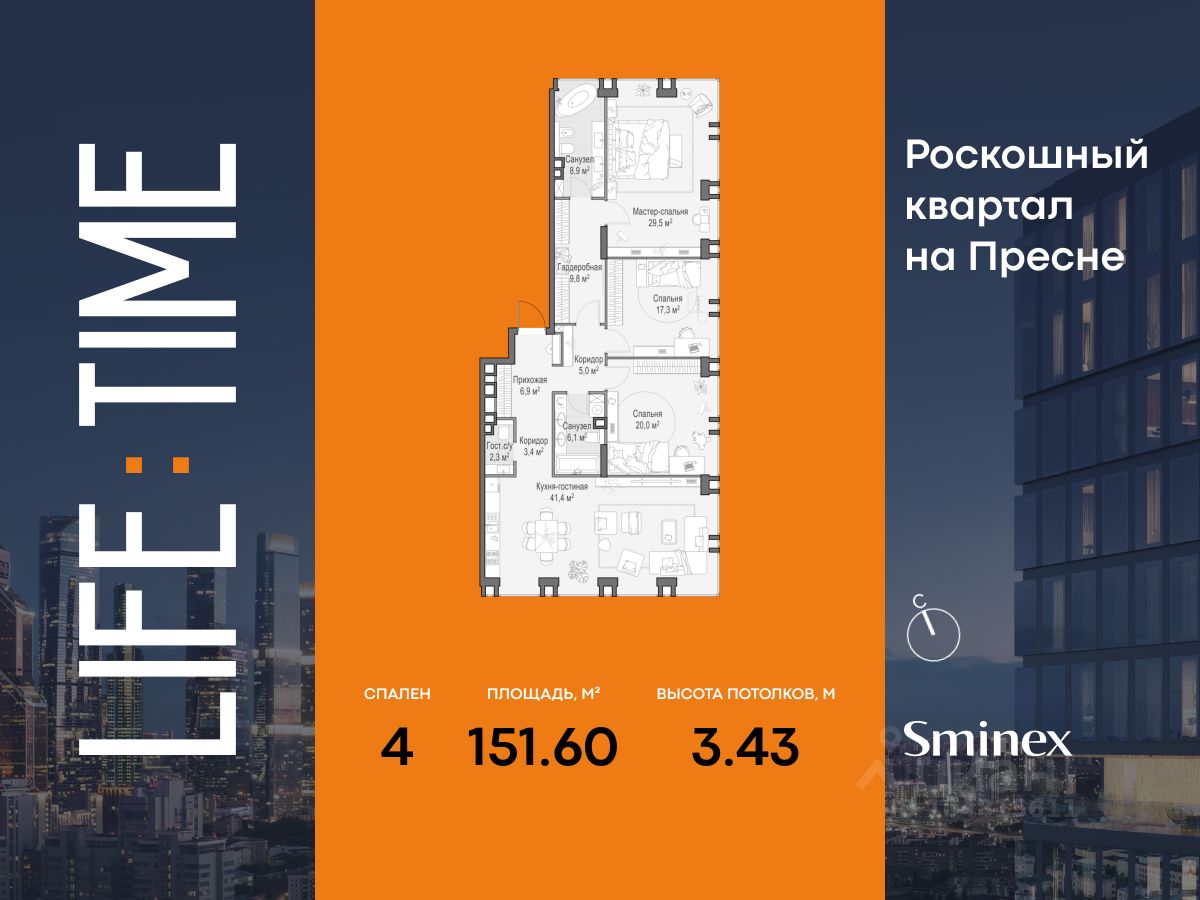 Просторная светлая пятикомнатная квартира площадью 219,3 кв. м. Кухня-гостиная (48,2 кв. м) с окнами, выходящими в сторону восточной панорамы города и высоток в стиле сталинского ампира. Большое панорамное окно в с/у с возможностью открывания настежь улучшает видовые характеристики. Продуманная планировка позволяет разместить четыре мастер-спальни с отдельными санузлами и гардеробными и одним просторным кабинетом площадью 14 кв. м. Life Time - роскошный современный квартал на Пресне, в наиболее быстро растущем премиальном районе ЦАО. Его насыщенная инфраструктура и выгодное расположение дарят время для жизни. Вы больше не тратите его на дорогу или ожидание, при этом ни в чём себе не отказывая. На территории предусмотрено всё для комфортной жизни: • двор-парк площадью 1,8 гектара с прудом и фонтанами, • Clubhouse - инфраструктурный центр в отдельном здании с исчерпывающими возможностями для спорта, отдыха и досуга только для жителей, • спортивная инфраструктура на улице и в помещении, в том числе бассейн длиной 25 метров, хот-таб, хаммам, сауна, бьюти-зона, • клубная гостиная с террасой, • всё для развития и досуга детей любого возраста, в том числе детский сад и школа. Life Time находится в центре сложившегося премиального района, в окружении многочисленных парков. Удобная транспортная доступность и прямой выезд на Звенигородское шоссе позволяют без проблем добраться до Садового кольца и Москва-Сити. Архитектурный стиль квартала - роскошный минимализм. Дома десятилетиями будут выглядеть современно.