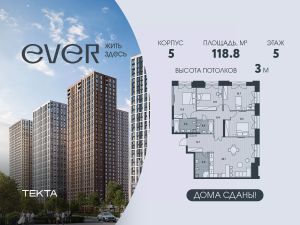 Рассрочка 0% с платежом от 120 000 ? в месяц. 5-комн. квартира в ЖК ''Ever'' на 5 этаже в 34 этажном здании Корпус 5. Общая площадь: 118.8 кв.м., жилая: 79.2 кв.м. Высота потолков 3.00 м. ЖК EVER это современный жилой комплекс в районе Обручева, всего в 7 минутах ходьбы от метро Калужская. В ЖК EVER представлены комфортабельные квартиры с разнообразными планировками, включая редкие форматы с мастер-спальнями и зимними садами. Благоустроенная территория с акцентом на природные элементы создает атмосферу спокойствия и уюта. В комплексе есть подземный паркинг и кладовые помещения. EVER это сочетание комфорта городской жизни и близости к природе.