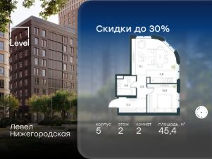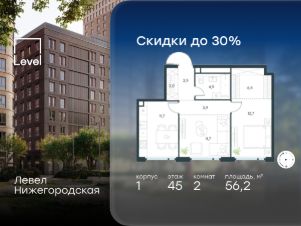 Цена указана с учётом скидки при 100%-й оплате, несубсидированной ипотеке, рассрочке (кроме программы ''Рассрочка 0%''). В активно развивающемся районе на юго-востоке столицы продается 2-комнатная квартира площадью 48,9 кв.м без отделки.. Квартира расположена на 27 этаже 37-этажного этажного корпуса 3 в жилом комплексе комфорт-класса Левел Нижегородская (компания Level Group/Левел групп). Отличная транспортная доступность- 10 мин. пешком до станции метро, МЦД-4, БКЛ и МЦК ''Нижегородская'',- 13 мин. пешком до станций метро ''Андроновка'' и ''Перово'',- 10 мин. на авто до ТТК,- 14 мин. на авто до Садового кольца. БлагоустройствоБлагоустроенная территория комплекса делится на внешнюю и внутреннюю. Внутренняя часть - это закрытый двор 0,9 га, где обустраиваются детские площадки для разных возрастных групп, беседки для отдыха и работы, несколько спортивных зон, включая воркаут-зоны и лужайку для бадминтона. Здесь же появится ухоженный луг с прогулочными маршрутами.Рядом с жилым комплексом будет создан ландшафтный парк площадью 2,4 га. В парке будут высажены высокие деревья, луговые травы и кустарники, благоустроены лаунж-зоны у пруда, дорожки для бега и прогулок. В центре парка предусмотрена событийная площадь, рядом расположатся дополнительные спортивные и детские площадки, а также зона для выгула домашних питомцев. Внутренняя инфраструктураДома жилого комплекса будут оснащены коммерческими помещениями, где откроются все необходимые сервисы: магазины, аптеки, салоны красоты, кофейни, службы доставки и многое другое. Комфорт - это когда всё рядом.Кроме того, на территории Левел Нижегородская предусмотрен подземный отапливаемый паркинг. Этап 1 включает 335 машино-мест и 143 кладовых помещения для хранения сезонных вещей. Технологии и безопасностьНа территории всех общественных зон постоянно ведется видеонаблюдение и предусмотрен высокоскоростной Wi-Fi. Подъезды, паркинг и внутренний двор оснащены системой контроля доступа. Для удобства жителей создано мобильное приложение, позволяющее связаться с управляющей компанией, осуществлять удаленное управление видеодомофоном или просмотреть изображение отдельных видеокамер по заявке.Для безопасного перемещения по этажам и комфортного спуска в паркинг будут установлены современные лифты от компании BLT Brilliant Elevator. Скорость лифтов - 1,6 - 2,5 м/с. Особенности- Архитектура от экспертов из бюро ARCH(E)TYPE,- Разноуровневая застройка - от секций средней этажности до высоток в 45 этажей (этап 1),- Окна шириной до 2,2 метров (этап1) с видами на Останкинскую башню, Измайловский парк, ''Москва-Сити'' и Кусковский лесопарк,- Лобби с окнами в пол и потолками от 3,4 метров, оснащенные консьерж-сервисом,- Более 35 видов планировок, включая редкие форматы.Артикул 3-311.