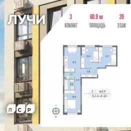 Продается 3-комн. кв-ра площадью 60.90 кв.м на 21 этаже 24 этажного монолитного дома в ЖК ''ЛУЧИ'' от Группа ЛСР. Семейный квартал ''Лучи'' расположен в ЗАО в одном из самых зелёных и благоприятных для жизни районов столицы Солнцево, который характеризуется отличной транспортной доступностью, развитой социальной инфраструктурой и обилием зеленых пространств в шаговой доступности. В 300 метрах от жилых корпусов ''Лучи'' расположена станция метро ''Солнцево'' Солнцевской ветки. Рядом находится станция ''Боровское шоссе'' этой же линии метрополитена. Через район проходит множество маршрутов наземного общественного транспорта: за 15 минут на автобусе можно добраться до станции метро ''Саларьево'', а за 30 — до ''Юго-Западной''. Также рядом с ''Лучами'' — железнодорожные станции МЦД-4 ''Солнечная'' и ''Новопеределкино''. Удобство перемещения автомобилистам обеспечивает близость трех важных проспектов: Ленинского, Вернадского и Мичуринского. В зависимости от дорожной ситуации, добраться в ''Лучи'' из центра столицы можно всего за 30 минут. С другой стороны, жилой комплекс удобно расположен между Киевским и Боровским шоссе.