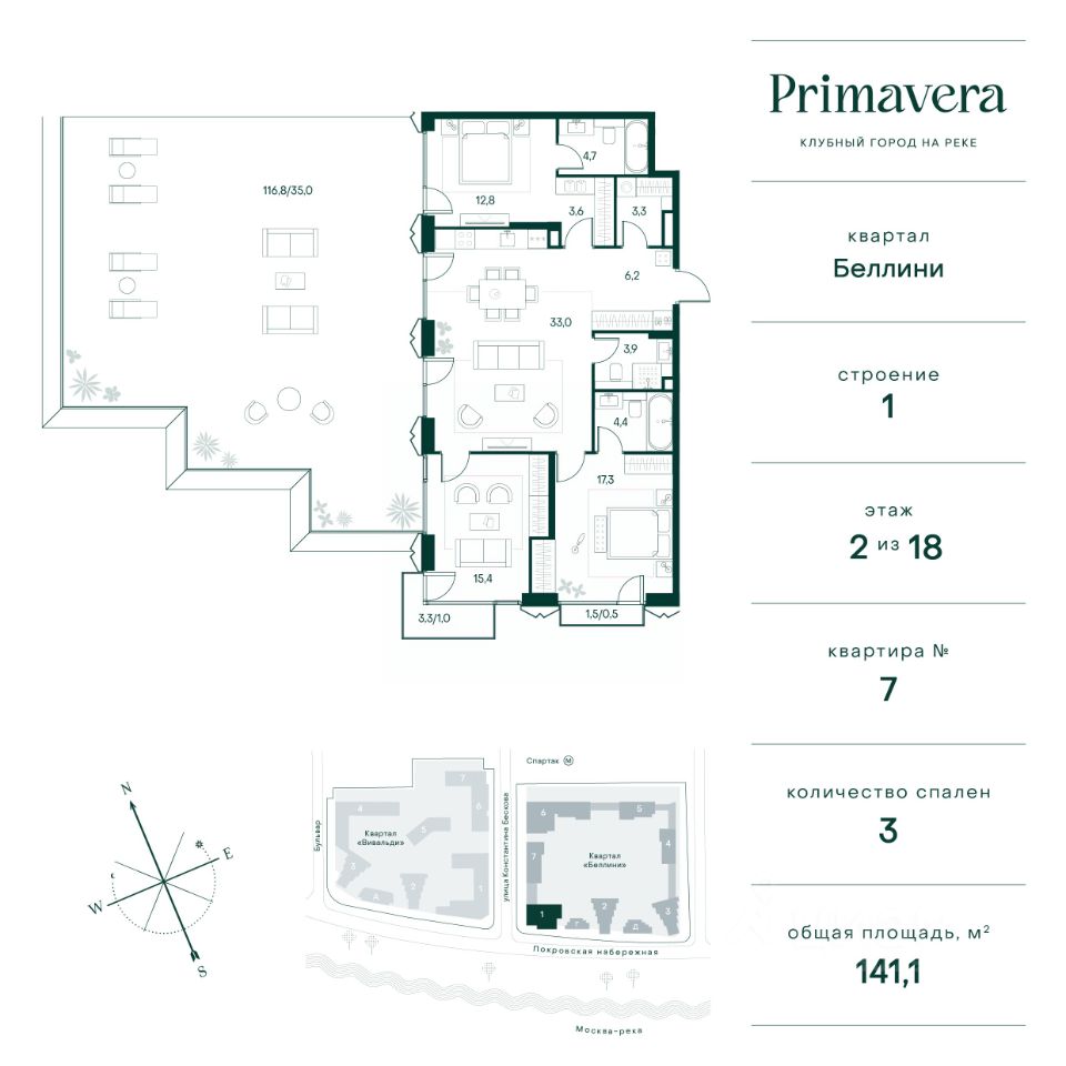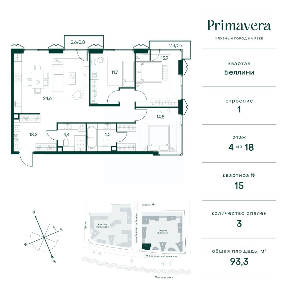 Клубный город на реке Primavera — это современный жилой комплекс премиум-класса, расположенный на первой береговой линии Москвы-реки в экологически чистом районе Покровское-Стрешнево. Под панорамными окнами квартир находится собственный экопарк с продуманной сетью прогулочных дорожек и современными детскими и спортивными площадками. За парком расположена набережная с собственным пляжем и зонами для отдыха. Клубный город на реке Primavera предлагает широкий выбор планировок для различных жизненных сценариев: от просторных однокомнатных квартир до пентхаусов и жилых помещений с террасами и патио. Выберите из 120 вариантов эргономичных планировок стандартного и евроформата. Из каждой квартиры открываются красивые виды на реку с углом обзора в 270 градусов. Дизайнерские лобби предлагают панорамный обзор на благоустроенный двор. Высокие потолки в 6 метров и качественная отделка создают атмосферу, схожую с пятизвездочными отелями. В Primavera есть всё необходимое для комфортной жизни в мегаполисе: •Образование для детей в шаговой доступности: 4 школы, 8 детских садов и развивающие центры с кружками и секциями. •Удобства на расстоянии приятной прогулки: супермаркеты, кафе, рестораны с верандами, салоны красоты, аптеки и многофункциональный центр для шоппинга и развлечений. •Умный дом: автоматизированное бесконтактное управление основными системами доступа и безопасности через мобильное приложение. Клубный город на реке Primavera выгодно сочетает комфорт городской жизни с близостью к природе. Живите в месте, где все создано для вашего удобства!