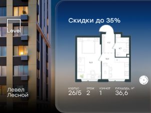 Цена указана с учётом скидки при 100%-й оплате, несубсидированной ипотеке, рассрочке (кроме программы ''Рассрочка 0%'').В районе, утопающем в густой зелени лесов, многочисленных парков и скверов, продаётся 1-комнатная квартира площадью 36.60 кв.м с отделкой white box. Квартира расположена на 2 этаже в жилом комплексе комфорт-класса Левел Лесной (компания Level Group/Левел групп). Жилой квартал Левел Лесной расположен в посёлке Отрадное Красногорского района Московской области. Это уникальный природный уголок вблизи района Митино. Посёлок окружён обширными лесными массивами. Обилие зелени создаёт благоприятный экологический фон и превращает этот район в оазис спокойствия и единения с природой.Расположение и инфраструктура:- Район окружен роскошной зеленью лесов и парковых зон, занимающих территорию свыше 1 000 гектаров, среди них лесопарк внутри жилого комплекса, загородный парк ''Отрада'', Митинский лесопарк, набережная реки Синички.- Идеальные условия для активного отдыха в любое время года: пешие и велопрогулки, бег, зимой - лыжи и катание на ватрушках.- На территории ЖК - частная школа ''Светлые Горы'', входящая в топ лучших школ Москвы и Подмосковья (Forbes Education, 2023), и детский сад, в пешей доступности расположены 9 детских садов.- На территории жилого комплекса - сетевые супермаркеты, локальные магазины, аптеки, салоны красоты, рестораны и другие объекты инфраструктуры в сданных корпусах. В 12 мин. пешком - крупный торговый парк ''Отрада'' с гипермаркетами, кинотеатром и детскими развлечениями.Отличная транспортная доступность:- 25 мин. пешком до станции метро ''Пятницкое шоссе'',- 28 мин. на автобусе до станции метро и МЦД-2 ''Волоколамская'',- 11 мин. на авто до МКАД,- 25 мин. на авто до ТТК.Продуманный архитектурный проект:- Концепция проекта Левел Лесной разработана бюро СПИЧ,- Высотность комплекса до 15 этажей с уникальными видами на лесные массивы и город,- Высота потолков до 3 м,- Современные окна высотой до 1,6 м, в части квартир предусмотрены окна в пол. Высота подоконников 0,6 м.Благоустройство:Продуманное пространство и аура приватного европейского городка рождают чувство лёгкости и расслабления у каждого, кто попадает на территорию проекта. Концепцию общественных площадок разработали в партнёрстве два архитектурных бюро: Highlight Architecture и SCAPE. В безопасных дворах без машин каждый обязательно найдёт себе место для вдохновения, отдыха и спорта.