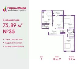Продается 3-комн. квартира с предчистовой отделкой в ЖМ ''Город Мира'' на 8 этаже. Общая площадь: 75.89 кв.м., жилая: 41.32 кв.м., площадь просторной кухни-столовой: 12.04 кв.м. Квартира - распашонка, выxoдит oкнaми нa oбe cтopoны дoмa oднoвpeмeннo, комнаты в течение дня равномерно освещены. В квартире одна лоджия, один совмещенный и один раздельный санузел. Высота потолков 2.7 м. ''Город Мира'' это масштабный жилой комплекс, созданный для тех, кто ценит комфорт, безопасность и гармонию с природой. Здесь продумана каждая деталь от удобной инфраструктуры до эргономичных планировок квартир. ''Город Мира'' победил в номинации ''Лучший экологический проект года в сфере строительства'' по версии премии Сrimеа Urbаn Аwаrds. Способы приобретения недвижимости в ''Городе Мира'':1. Ипотека: семейная от 5,5%, военная, IT-ипотека, базовая ипотечная программа и комбо-ипотека. Одобрение заявки проходит сразу в отделе продаж. 2. Материнский капитал на первый взнос.3. Рассрочка от застройщика - до июня 2028 года! Первоначальный взнос от 30%.4. Военная ипотека. Участники НИС могут приобрести квартиры по спец.цене. Ключевые преимущества комплекса:удачное расположение зеленый район с благоприятным микроклиматомпродуманное зонирование жилые кварталы, зоны отдыха и коммерческие объектыкомфорт-класс высокое качество строительства и современные инженерные решения Почему выбирают ''Город Мира'': Образование и досуг: 2 детских сада (по 260 мест каждый) планируется строительство общеобразовательной школы детские и спортивные площадки в каждом дворе беседки для отдыха, зоны для выгула собак Ритейл и сервис: магазины, аптеки, медицинские центры фитнес-клубы, салоны красоты детские развивающие центры Парковки: гостевые парковки наземные и подземные паркинги Квартиры с продуманным комфортом: просторные планировки с гардеробными и 2-мя санузлами лоджии с остеклением автономное отопление выполнена стяжка пола Благоустройство территории: ландшафтный дизайн с зонами отдыха современные детские площадки стильные холлы с дизайнерской отделкой система видеонаблюдения для безопасности ''Город Мира'' это место, где созданы все условия для комфортной жизни. Выбирайте качество и продуманность в каждой детали! Дом монолитно-блочный, двухподъездный, высотой 9 этажей. Квартира находится в 1-й секции в корпусе 1. На этаже 5 квартир. В подъезде 1 пассажирский и 1 грузовой лифт. Окончание строительства - 1 квартал 2028 года. Оформление сделки по договору долевого участия. #z6e9zo