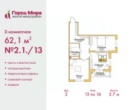 Торопитесь забронировать по акционной цене, срок предложения ограничен! Стоимость квартиры указана со скидкой, ваша экономия составит 307,500 руб. Звоните, наши менеджеры вам все расскажут. Просторная 2-комн. квартира с предчистовой отделкой в ЖМ ''Город Мира'' на 13 этаже. Общая площадь: 62.1 кв.м., жилая: 26.7 кв.м., площадь просторной кухни-столовой: 14.7 кв.м. Квартира угловая, идеально подойдет любителям тишины и панорамных видов. В квартире одна лоджия, один совмещенный санузел. Высота потолков 2.7 м. ''Город Мира'' это масштабный жилой комплекс, созданный для тех, кто ценит комфорт, безопасность и гармонию с природой. Здесь продумана каждая деталь от удобной инфраструктуры до эргономичных планировок квартир. ''Город Мира'' победил в номинации ''Лучший экологический проект года в сфере строительства'' по версии премии Сrimеа Urbаn Аwаrds. Способы приобретения недвижимости в ''Городе Мира'':1. Ипотека: семейная от 5,5%, военная, IT-ипотека, базовая ипотечная программа и комбо-ипотека. Одобрение заявки проходит сразу в отделе продаж. 2. Материнский капитал на первый взнос.3. Рассрочка от застройщика - до июня 2028 года! Первоначальный взнос от 30%.4. Военная ипотека. Участники НИС могут приобрести квартиры по спец.цене. Ключевые преимущества комплекса:удачное расположение зеленый район с благоприятным микроклиматомпродуманное зонирование жилые кварталы, зоны отдыха и коммерческие объектыкомфорт-класс высокое качество строительства и современные инженерные решения Почему дом повышенной комфортности 2 в ''Городе Мира'' это лучшее решение? Образование и досуг: 2 детских сада (по 260 мест каждый) планируется строительство общеобразовательной школы детские и спортивные площадки в каждом дворе беседки для отдыха, зоны для выгула собак Ритейл и сервис: магазины, аптеки, медицинские центры фитнес-клубы, салоны красоты детские развивающие центры Парковки: гостевые парковки наземные и подземные паркинги Квартиры с продуманным комфортом: просторные планировки с кладовыми и колясочными лоджии с остеклением лапомойки для питомцев на первых этажах домов индивидуальное отопление выполнена стяжка пола и штукатурка стен консьерж-сервис для дополнительного удобства Благоустройство территории: ландшафтный дизайн с зонами отдыха современные детские площадки стильные холлы с дизайнерской отделкой система видеонаблюдения для безопасности ''Город Мира'' это место, где созданы все условия для комфортной жизни. Выбирайте качество и продуманность в каждой детали! Квартира находится во доме повышенной комфортности 2, 4-я очередь. Дом монолитно-каркасный, одноподъездный, высотой 16 этажей. В подъезде 1 пассажирский и 1 грузовой лифт. Окончание строительства - 2 квартал 2028 года. Оформление сделки по договору долевого участия. Квартира находится в корпусе 2. Дом монолитный, одноподъездный, высотой 16 этажей. На этаже 7 квартир. В подъезде 1 пассажирский и 1 грузовой лифт. Окончание строительства - 2 квартал 2