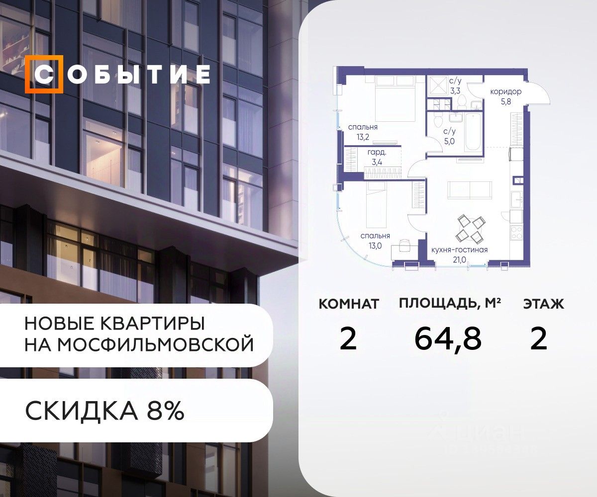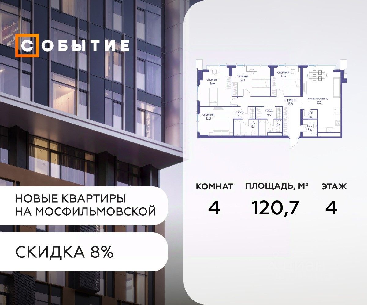 Около 10 минут до Москва Сити и ТТК! В продаже 4-к квартира от застройщика. Общая площадь 120.7, жилая 28.1, кухня 92.6. Квартира расположена на 4 этаже жилого квартала ''Событие-6'', корпус 2, Секция Секция 5. Квартира без отделки. Срок сдачи: 4 кв. 2029 года. СОБЫТИЕ.6 — финальный дом парк квартала СОБЫТИЕ на Мосфильмовской, созданный для тех, кто хочет ''заняться жизнью'' здесь и сейчас и получать максимум от каждого дня. Стильная архитектура, продуманное благоустройство и богатый набор общественных пространств делают дом естественной сценой для ярких личных событий. Архитектура от бюро Atrium на базе дизайн кода британских LDA Design и UHA London. Лучшая новостройка страны 2025 года! Расположение: • Около 710 минут пешком до станций метро ''Аминьевская'' и ''Мичуринский проспект'' (в зависимости от маршрута) • Около 15 минут до Садового кольца • Около 25 минут до аэропорта Внуково • Рядом — ключевые магистрали (Кутузовский, Мичуринский, Ломоносовский проспекты, Аминьевское шоссе), что упрощает выезды как в центр, так и за город Инфраструктура ''всё у дома'' Главный центр притяжения — модный парк ''Событие'' от бюро Wowhaus. Благоустроенный бульвар и рекреационные зоны занимают около половины территории квартала, а природная часть парка площадью более 12 гектаров уже открыта. В парке проложены: • примерно 1,5 км беговых дорожек • около 2,7 км велодорожек • около 1,6 км экотропы • детские и спортивные площадки, места для пикника, лекторий, декоративный огород, восстановленные биотопы • Парк ''Событие'' — финалист конкурса Правительства Москвы в номинации ''Строительство парков и общественных пространств'' Мультидвор Двор СОБЫТИЯ.6 — это мультимодальное пространство для жителей всех возрастов. Здесь предусмотрены: • игровые и развивающие площадки для малышей и детей постарше • воркаут зоны, площадки для игр с мячом и йоги для активных взрослых • мини бульвар с фонтаном для прогулок • террасы, амфитеатры и лаунжи для спокойного отдыха и встреч • Комьюнити террасы и общественные пространства на кровле 10 этажа Внутри дома предусмотрен полный набор общественных пространств: • детская игровая комната и детский клуб • спортрум / фитнес рум • коворкинг и комнаты для занятий с репетитором • дизайнерские лаунж зоны для деловых и личных встреч Район и окружение: парки, университеты, спорт Район относится к числу самых экологичных в Москве: он буквально утопает в зелени парков и заповедников. В окружении — парк ''Событие'', природный заказник ''Долина реки Раменки'', Воробьевы горы, Матвеевский лес, парк 50 летия Октября, парк Олимпийской деревни, Вороновский парк, набережные Москвы реки, заказник ''Долина реки Сетунь''. Это настоящая ''интеллектуальная миля'' Москвы: рядом МГУ имени М. В. Ломоносова, ботанический сад МГУ, театр им. Н. И. Сац, Новодевичий монастырь, стадион ''Лужники'', Парк Победы и другие знаковые объекты. Район особенно комфортен для сторонников ЗОЖ: множество мест для бега, велопрогулок, спорта на открытом воздухе и