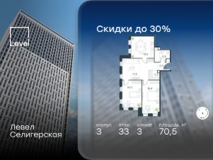 Цена указана с учётом скидки при 100%-й оплате, несубсидированной ипотеке, рассрочке (кроме программы ''Рассрочка 0%'').В жилом квартале, расположенном в южной части района Западное Дегунино, продаётся 2-комнатная квартира площадью 61.00 кв.м без отделки. Квартира расположена на 2 этаже 40-этажного корпуса 3 в жилом комплексе комфорт-класса Левел Селигерская (компания Level Group/Левел групп).Отличная транспортная доступность:- 10 мин. пешком до станции метро ''Верхние Лихоборы'',- 15 мин. пешком до станции метро ''Селигерская'',- 20 мин. пешком до станции МЦД-3 ''Моссельмаш'',- 11 мин. на авто до МКАД,- 13 мин. на авто до ТТК,- 16 мин. на авто до Садового кольца.РасположениеРайон отличается богатой социальной инфраструктурой: школы, детские сады, поликлиники, магазины, фитнес-клубы, торговые центры - всё близко к дому. Рядом с Левел Селигерская расположено 5 парковых зон. В 3 минутах от дома расположен перспективный сквер-парк. В 10 минутах пешком находится парк им. Святослава Фёдорова, в 13 минутах на велосипеде - парк ''Ангарские пруды''. В 7-11 минутах на автомобиле - два крупных природных объекта: Тимирязевский парк и Главный ботанический сад Российской академии наук.БлагоустройствоВнутренние дворы жилого комплекса огорожены от машин, а их функциональное наполнение отличается в зависимости от очереди строительства. На территории 2-й очереди жителей ждут уютные навесы с качелями, павильон-читальня, волейбольная площадка, беседки, а также детские и спортивные площадки.Технологии и инженерияДля входа на территорию комплекса предусмотрен единый ключ доступа. Все общественные зоны оснащены камерами видеонаблюдения, по заявке собственнику предоставляется возможность просмотра изображения отдельных видеокамер на его мобильном устройстве. При въезде в паркинг функционирует система распознавания госномеров. Кроме того, для комфорта жителей создано мобильное приложение, с помощью которого можно удаленно контролировать доступ на придомовую и жилую территории.Другие преимущества жилого комплекса- Высокая освещённость квартир: в большинстве из них не менее трёх окон,- Супермаркет, магазины, кафе, пекарни и многое другое на первых этажах домов,- Частный детский сад,- Стильные дизайнерские лобби с высокими потолками до 4,3 м. и окнами в пол, для питомцев предусмотрена лапомойка,- 30+ планировочных решений: от компактных студий до просторных семейных квартир,- С каждого этажа дома на лифте можно спуститься в подземный отапливаемый паркинг.''