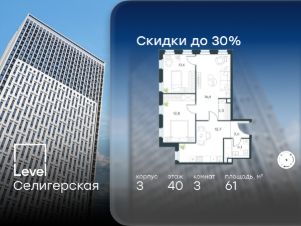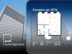 Цена указана с учётом скидки при 100%-й оплате, несубсидированной ипотеке, рассрочке (кроме программы ''Рассрочка 0%'').В жилом квартале, расположенном в южной части района Западное Дегунино, продаётся 1-комнатная квартира площадью 34.60 кв.м без отделки. Квартира расположена на 39 этаже 40-этажного корпуса 3 в жилом комплексе комфорт-класса Level Селигерская (компания Level Group/Левел групп).Отличная транспортная доступность:- 10 мин. пешком до станции метро ''Верхние Лихоборы'',- 15 мин. пешком до станции метро ''Селигерская'',- 20 мин. пешком до станции МЦД-3 ''Моссельмаш'',- 11 мин. на авто до МКАД,- 13 мин. на авто до ТТК,- 16 мин. на авто до Садового кольца.РасположениеРайон отличается богатой социальной инфраструктурой: школы, детские сады, поликлиники, магазины, фитнес-клубы, торговые центры - всё близко к дому. Рядом с Level Селигерская расположено 5 парковых зон. В 3 минутах от дома расположен перспективный сквер-парк. В 10 минутах пешком находится парк им. Святослава Фёдорова, в 13 минутах на велосипеде - парк ''Ангарские пруды''. В 7-11 минутах на автомобиле - два крупных природных объекта: Тимирязевский парк и Главный ботанический сад Российской академии наук.БлагоустройствоВнутренние дворы жилого комплекса огорожены от машин, а их функциональное наполнение отличается в зависимости от очереди строительства. На территории 2-й очереди жителей ждут уютные навесы с качелями, павильон-читальня, волейбольная площадка, беседки, а также детские и спортивные площадки.Технологии и инженерияДля входа на территорию комплекса предусмотрен единый ключ доступа. Все общественные зоны оснащены камерами видеонаблюдения, по заявке собственнику предоставляется возможность просмотра изображения отдельных видеокамер на его мобильном устройстве. При въезде в паркинг функционирует система распознавания госномеров. Кроме того, для комфорта жителей создано мобильное приложение, с помощью которого можно удаленно контролировать доступ на придомовую и жилую территории.Другие преимущества жилого комплекса- Высокая освещённость квартир: в большинстве из них не менее трёх окон,- Супермаркет, магазины, кафе, пекарни и многое другое на первых этажах домов,- Частный детский сад,- Стильные дизайнерские лобби с высокими потолками до 4,3 м. и окнами в пол, для питомцев предусмотрена лапомойка,- 30+ планировочных решений: от компактных студий до просторных семейных квартир,- С каждого этажа дома на лифте можно спуститься в подземный отапливаемый паркинг.''