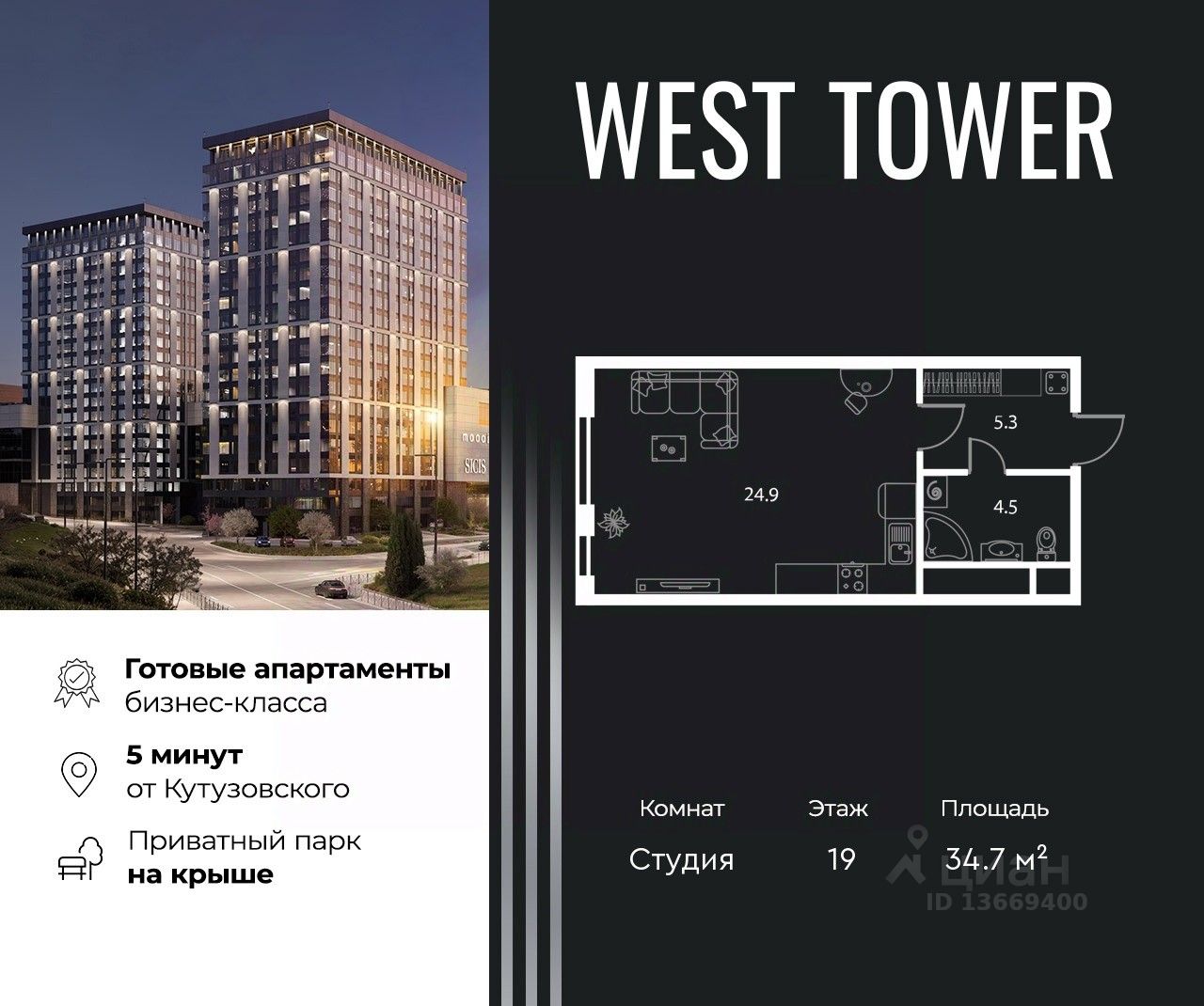 Этаж: 19, комнатность: Студия Площадь: 34.7 кв.м. Студия в West Tower- это идеальные апартаменты для индивидуальности. Простор открытой планировки, в сочетании с инфраструктурой комплекса и отличной экологией вокруг дают отличную основу для покорения вершин. Здесь только самое необходимое. Эти апартаменты больше других подобных подходят для зонирования. Можно легко отделить хоум офис от кухни, а пространство для приема гостей от зоны отдыха. West Tower — апартаменты с премиальным сервисом на Аминьевском шоссе. Развитая инфраструктура и хорошая транспортная доступность. Рядом три станции метро: Аминьевская, Давыдково и Мичуринский проспект. У подножия коплекса находится Природный заказника Долина реки Сетунь, который дополнен собственным парком на крыше. Архитектура Строгий, харизматичный стиль проекта West Tower отражает в себе концепцию рационального проектирования и прагматичного подхода. Здесь все продумано до мельчайших деталей. Инфраструктура в доме Торговая галерея Kvartal West расположилась на первых этажах комплекса. Более 150 бутиков, кафе и рестораны, игровые центры, кинотеатр Синема Стар и премиальный фитнес-клуб World Class с бассейном. Комфорт и безопасность Премиальный консьерж-сервис 24/7, круглосуточная охрана, видеонаблюдение, система СКУД, закрытый охраняемый паркинг и эксклюзивное мобильное приложение для решения бытовых вопросов резидентов.