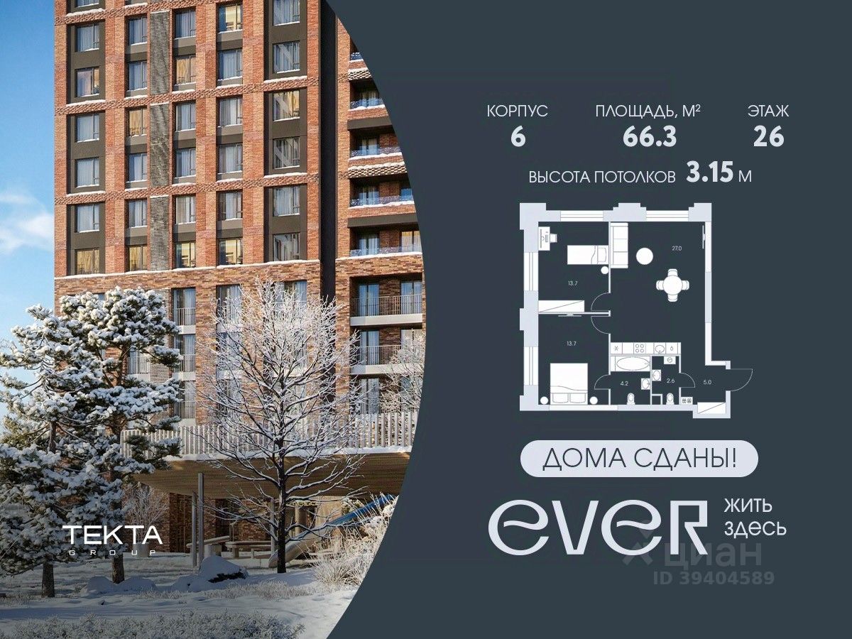 Рассрочка 0% с платежом от 120 000 ? в месяц. 3-комн. квартира в ЖК ''Ever'' на 26 этаже в 34 этажном здании Корпус 6. Общая площадь: 66.3 кв.м., жилая: 42.7 кв.м. Высота потолков 3.15 м. ЖК EVER это современный жилой комплекс в районе Обручева, всего в 7 минутах ходьбы от метро Калужская. В ЖК EVER представлены комфортабельные квартиры с разнообразными планировками, включая редкие форматы с мастер-спальнями и зимними садами. Благоустроенная территория с акцентом на природные элементы создает атмосферу спокойствия и уюта. В комплексе есть подземный паркинг и кладовые помещения. EVER это сочетание комфорта городской жизни и близости к природе.