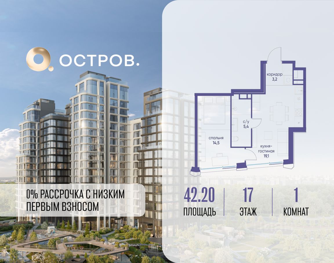 Продаётся 1-комн. квартира от застройщика: общая площадь 42.20 м², жилая 14.50 м², кухня 19.10 м², 17-й этаж, жилой квартал ''Остров 12'', корпус 2 (секция 1). Срок сдачи: 1 квартал 2029 года. 1 совмещенный санузел. В жилой зоне 2 больших окна на одну сторону, хорошая инсоляция. Позвоните сейчас и забронируйте квартиру! ОСТРОВ от Донстрой - жилой комплекс на западе Москвы, в Мневниковской пойме. Уникальное преимущество комплекса - в том, что он обособлен от города рекой и природным парком (650 га). Благодаря природному окружению эта территория имеет лучший экологический рейтинг в столице. Кварталы ОСТРОВА объединены ландшафтным дизайном в единое пространство - с набережными и Центральным бульваром. На ОСТРОВЕ любые объекты, необходимые для полноценной жизни и отдыха, находятся на расстоянии 15-минутной прогулки. Торговый центр и супермаркеты, кафе и рестораны, фитнес, салоны красоты, школы и детские сады. А также крупнейший в Москве спортивный кластер.