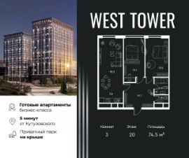 Этаж: 20, комнатность: 3 Площадь: 74.5 кв.м. Продаются апартаменты в многофункциональном комплексе бизнес-класса West Tower в ЗАО. 3 - комнатные апартаменты в West Tower это идеальные апартаменты для индивидуальности. Простор открытой планировки, в сочетании с инфраструктурой комплекса и отличной экологией вокруг дают отличную основу для покорения вершин. Здесь только самое необходимое. Эти апартаменты больше других подобных подходят для зонирования. Можно легко отделить хоум офис от кухни, а пространство для приема гостей от зоны отдыха. West Tower — апартаменты с премиальным сервисом на Аминьевском шоссе. Развитая инфраструктура и хорошая транспортная доступность. Рядом три станции метро: Аминьевская, Давыдково и Мичуринский проспект. У подножия коплекса находится Природный заказника Долина реки Сетунь, который дополнен собственным парком на крыше. Архитектура Строгий, харизматичный стиль проекта West Tower отражает в себе концепцию рационального проектирования и прагматичного подхода. Здесь все продумано до мельчайших деталей. Инфраструктура в доме Торговая галерея Kvartal West расположилась на первых этажах комплекса. Более 150 бутиков, кафе и рестораны, игровые центры, кинотеатр Синема Стар и премиальный фитнес-клуб World Class с бассейном. Комфорт и безопасность Премиальный консьерж-сервис 24/7, круглосуточная охрана, видеонаблюдение, система СКУД, закрытый охраняемый паркинг и эксклюзивное мобильное приложение для решения бытовых вопросов резидентов.