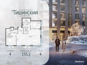 В продаже 4-комнатная квартира квартира в элитном квартале ''Тишинский бульвар''.Общая площадь квартиры - 135.20 кв.м. Этаж 4 из 14.Корпус К3.''Тишинский бульвар'' - тихий зелёный элитный квартал на Тишинке, в престижном и комфортном районе центра Москвы. В нём создан уникальный для элитного дома прогулочный бульвар в своём огромном парке 1,9 га. В парке оборудованы зоны для активного и тихого отдыха, крытые галереи, приватные зелёные комнаты, многофункциональная спортивная площадка, воркаут-зона, детская площадка, сухой фонтан, ручей.В пешей доступности Римско-католический кафедральный собор. Всего в полутора километрах от квартала находятся Патриаршие пруды - излюбленное место для летних прогулок, воскресных бранчей и романтических ужинов. Белая площадь расположена ещё ближе - на расстоянии 1,2 километра. Это точка концентрации деловой жизни и модных ресторанов.В ''Тишинский бульваре'' только для жителей и их гостей создан уникальный для элитного дома прогулочный бульвар в собственном огромном парке площадью 2,1 га, который занимает 70% территории квартала. Бульвар проходит через весь квартал и объединяет в общее пространство три двора: Кленовый, Рябиновый и Ивовый.В парке созданы крытые галереи и приватные зелёные комнаты для отдыха и медитаций в любую погоду. Насыщенное озеленение многолетними растениями с разными периодами цветения сохраняет территорию квартала красивой круглый год.В квартале насыщенная инфраструктура только для жителей, включая Clubhouse. Здесь оборудованы пространства для здорового образа жизни по стандарту FIT LAB: в парке - многофункциональная спортивная площадка, воркаут-зона, место для занятий йогой и медитации, бесплатный фитнес-клуб с бассейном. Для маленьких жителей доступны детская площадка и игровая комната по стандарту KIDS LAB.Дома оснащены самыми полными и лучшими системами.