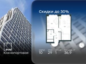 Цена указана с учётом скидки при 100%-й оплате, несубсидированной ипотеке, рассрочке (кроме программы ''Рассрочка 0%'').В северной части района Печатники продается 1-комнатная квартира площадью 35.30 кв.м без отделки. Квартира расположена на 38 этаже 49-этажного корпуса 8 в жилом комплексе комфорт-класса Level Южнопортовая (компания Level Group/Левел групп). Отличная транспортная доступность:- 10 мин. пешком до станции метро ''Кожуховская'',- 20 мин. пешком до станции МЦК ''Дубровка'',- 3 мин. на авто до ТТК,- 13 мин. на авто до Садового кольца,- 15 мин. на авто до Бульварного кольца. Продуманный архитектурный проект:- авторская архитектура от бюро СПИЧ,- уникальные виды на реку, парки и достопримечательности города,- высота потолков в квартирах до 6 м,- окна высотой до 1,87 м с высоким коэффициентом сопротивления теплоотдаче. Расположение:Level Южнопортовая строится в северной части района Печатники - самой приближенной к центру. Здесь будет сформирован новый район ''Южный порт'', где построят крупный жилой и общественно-деловой центр, аналогичный Москва-Сити. В течение 10-12 лет в этом месте появятся не только жилые дома, но и развитая инфраструктура для жизни и работы. А еще совсем рядом находится набережная Москвы-реки, где планируется построить причалы для речных трамвайчиков и канатную дорогу.Уже сейчас вокруг жилого комплекса работают десятки магазинов и торговых центров, рядом расположено 6 парков, среди которых музей-заповедник ''Коломенское''. В 10 минутах пешком - 2 муниципальных и 2 частных детских сада, 7 общеобразовательных школ.Внутренняя инфраструктура:Для отдыха жителей в каждом корпусе предусмотрено лобби, оснащенное местами для отдыха, гостевыми санузлами и лапомойками, а в отдельных корпусах - камином. За счёт больших окон и высоких потолков пространства будут наполнены воздухом и светом.На первых этажах жилого комплекса откроются магазины, салоны красоты, фитнес-центр. Для детей строятся собственные детский сад и школа. Благоустройство:Внутренний двор комплекса разработан совместно с бюро GAFA. Основная идея - создать аналог Центрального парка в Нью-Йорке, гармонично сочетая высотные здания и большое изолированное парковое пространство.Вся площадь двора-парка будет огорожена и составит более 2 га, из которых 45% - озеленение. Одним из самых важных ландшафтных элементов здесь станет небольшая речка, наполняющаяся во время дождя. Вокруг неё появится сеть из островов, внутри которых расположатся тематические зоны спорта и отдыха. Технологии и инженерия:- автоматическая передача в управляющую компанию показаний квартирных счётчиков,- телефонная связь, телевидение и интернет на базе оптической мультисервисной сети,- гостевой Wi-Fi в лобби и на территории двора,- единый ключ доступа для входа на территорию комплекса.