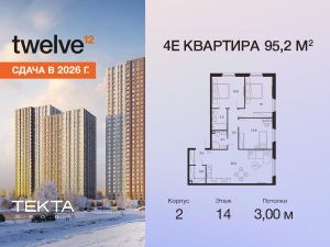 Рассрочка 0% с платежом от 120 000 ? в месяц. Сдача уже в 2026 году 4-комн. квартира в ЖК ''Twelve'' на 14 этаже в 22 этажном здании Корпус 2. Общая площадь: 95.2 кв.м., жилая: 62.90 кв.м. Высота потолков 3.00 м. ЖК Twelve от застройщика Tekta Group — это новый уровень жизни в районе Нагорный в 3-х минутах от станции метро. Проект представляет собой воплощение современной концепции комфортной жизни, где функциональность органично сочетается с эстетикой. Архитектура Twelve создает атмосферу, вдохновляющую на успех и располагающую к позитивным эмоциям. Дом, в котором каждый день будет наполнен уютом, а не рутинной работой и дорожными пробками. Twelve предлагает своим жильцам продуманные планировки, возможность объединения квартир, а также увидеть красоту города через угловое остекление увеличенных окон. Особое внимание уделено комфорту жителей: благоустроенная территория, зеленые насаждения, детские площадки, парковка. ЖК Twelve — это больше, чем просто жилье: это атмосфера умиротворенности, комфорта и гармонии.
