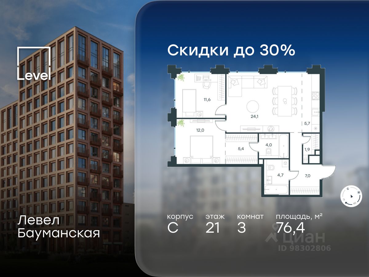 24 м² · Этаж 12 из 21