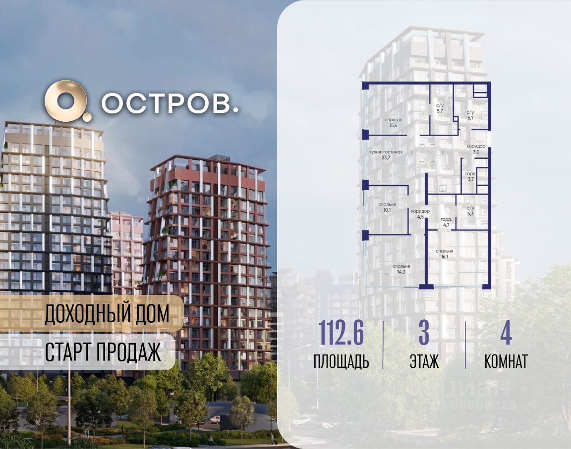К покупке предлагается шикарнейшая четырёхкомнатная квартира без отделки в ЖК ''Остров''. Увеличенные окна квартиры расположены на две стороны света, за счёт чего в квартире прекрасная инсоляция. Панорамные окна кухни-гостиной и мастер-спальни ориентированы на северо-восточную и юго-восточную стороны света с видами на реку и парки. Две спальни ориентированы на северо-восточную сторону с видами на территорию жилого комплекса. Планировкой предусмотрено: Просторная кухня-гостиная Три спальни (две из них с собственной ванной и гардеробными) Холл+гардеробная+гостевой санузел Дополнительно к квартире имеются машино-места и кладовки, условия приобретения которых обсуждаются отдельно. ОСТРОВ — премиальный жилой комплекс в окружении реки и 650 га природных парков, суперсовременная самодостаточная инфраструктура, продуманные общественные пространства, инновационные и экологичные решения в строительстве и благоустройстве территории. Закрытая территория с красивым ландшафтным дизайном, двор без машин. Дома с роскошными лобби, подземным паркингом с электро-зарядками, зоной хранения велосипедов, келлерами. На территории комплекса построена инновационная школа 2030 ''Школа будущего''. Здесь создается крупнейший в Москве спортивный кластер: от гребных баз до ледовой арены Татьяны Навки и хоккейной академии Александра Овечкина. В шаговой доступности поликлиника, детские сады, магазины, рестораны, маркетплейсы и прочая инфраструктура. Оперативный показ по предварительной записи! Один взрослый собственник, без обременений, полная стоимость в договоре! Указанная цена, может быть скорректирована в ходе конструктивного диалога с заинтересованным покупателем! С21 Premium Property участник ассоциации AREA. Арт. 132116546