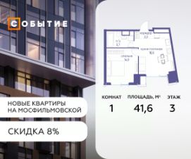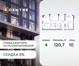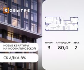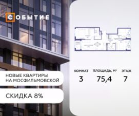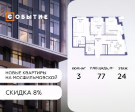 Около 10 минут до Москва Сити и ТТК! В продаже 3-к квартира от застройщика. Общая площадь 75.4, жилая 21.1, кухня 54.3. Квартира расположена на 7 этаже жилого квартала ''Событие-6'', корпус 2, Секция Секция 3. Квартира без отделки. Срок сдачи: 4 кв. 2029 года. СОБЫТИЕ.6 — финальный дом парк квартала СОБЫТИЕ на Мосфильмовской, созданный для тех, кто хочет ''заняться жизнью'' здесь и сейчас и получать максимум от каждого дня. Стильная архитектура, продуманное благоустройство и богатый набор общественных пространств делают дом естественной сценой для ярких личных событий. Архитектура от бюро Atrium на базе дизайн кода британских LDA Design и UHA London. Лучшая новостройка страны 2025 года! Расположение: • Около 710 минут пешком до станций метро ''Аминьевская'' и ''Мичуринский проспект'' (в зависимости от маршрута) • Около 15 минут до Садового кольца • Около 25 минут до аэропорта Внуково • Рядом — ключевые магистрали (Кутузовский, Мичуринский, Ломоносовский проспекты, Аминьевское шоссе), что упрощает выезды как в центр, так и за город Инфраструктура ''всё у дома'' Главный центр притяжения — модный парк ''Событие'' от бюро Wowhaus. Благоустроенный бульвар и рекреационные зоны занимают около половины территории квартала, а природная часть парка площадью более 12 гектаров уже открыта. В парке проложены: • примерно 1,5 км беговых дорожек • около 2,7 км велодорожек • около 1,6 км экотропы • детские и спортивные площадки, места для пикника, лекторий, декоративный огород, восстановленные биотопы • Парк ''Событие'' — финалист конкурса Правительства Москвы в номинации ''Строительство парков и общественных пространств'' Мультидвор Двор СОБЫТИЯ.6 — это мультимодальное пространство для жителей всех возрастов. Здесь предусмотрены: • игровые и развивающие площадки для малышей и детей постарше • воркаут зоны, площадки для игр с мячом и йоги для активных взрослых • мини бульвар с фонтаном для прогулок • террасы, амфитеатры и лаунжи для спокойного отдыха и встреч • Комьюнити террасы и общественные пространства на кровле 10 этажа Внутри дома предусмотрен полный набор общественных пространств: • детская игровая комната и детский клуб • спортрум / фитнес рум • коворкинг и комнаты для занятий с репетитором • дизайнерские лаунж зоны для деловых и личных встреч Район и окружение: парки, университеты, спорт Район относится к числу самых экологичных в Москве: он буквально утопает в зелени парков и заповедников. В окружении — парк ''Событие'', природный заказник ''Долина реки Раменки'', Воробьевы горы, Матвеевский лес, парк 50 летия Октября, парк Олимпийской деревни, Вороновский парк, набережные Москвы реки, заказник ''Долина реки Сетунь''. Это настоящая ''интеллектуальная миля'' Москвы: рядом МГУ имени М. В. Ломоносова, ботанический сад МГУ, театр им. Н. И. Сац, Новодевичий монастырь, стадион ''Лужники'', Парк Победы и другие знаковые объекты. Район особенно комфортен для сторонников ЗОЖ: множество мест для бега, велопрогулок, спорта на открытом воздухе и