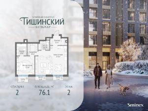 В продаже 2-комнатная квартира квартира в элитном квартале ''Тишинский бульвар''.Общая площадь квартиры - 76.10 кв.м. Этаж 2 из 9.Корпус 8С2.''Тишинский бульвар'' - тихий зелёный элитный квартал на Тишинке, в престижном и комфортном районе центра Москвы. В нём создан уникальный для элитного дома прогулочный бульвар в своём огромном парке 1,9 га. В парке оборудованы зоны для активного и тихого отдыха, крытые галереи, приватные зелёные комнаты, многофункциональная спортивная площадка, воркаут-зона, детская площадка, сухой фонтан, ручей.В пешей доступности Римско-католический кафедральный собор. Всего в полутора километрах от квартала находятся Патриаршие пруды - излюбленное место для летних прогулок, воскресных бранчей и романтических ужинов. Белая площадь расположена ещё ближе - на расстоянии 1,2 километра. Это точка концентрации деловой жизни и модных ресторанов.В ''Тишинский бульваре'' только для жителей и их гостей создан уникальный для элитного дома прогулочный бульвар в собственном огромном парке площадью 2,1 га, который занимает 70% территории квартала. Бульвар проходит через весь квартал и объединяет в общее пространство три двора: Кленовый, Рябиновый и Ивовый.В парке созданы крытые галереи и приватные зелёные комнаты для отдыха и медитаций в любую погоду. Насыщенное озеленение многолетними растениями с разными периодами цветения сохраняет территорию квартала красивой круглый год.В квартале насыщенная инфраструктура только для жителей, включая Clubhouse. Здесь оборудованы пространства для здорового образа жизни по стандарту FIT LAB: в парке - многофункциональная спортивная площадка, воркаут-зона, место для занятий йогой и медитации, бесплатный фитнес-клуб с бассейном. Для маленьких жителей доступны детская площадка и игровая комната по стандарту KIDS LAB.Дома оснащены самыми полными и лучшими системами.