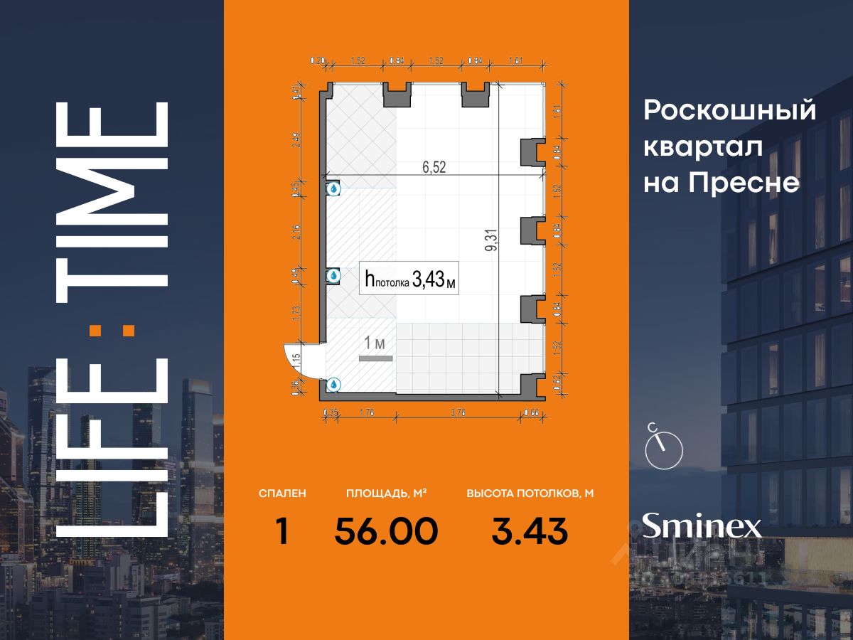 Просторная светлая квартира площадью 57,4 кв. м. Из кухни-гостиной (23 кв. м) открывается вид на парк ''Красногвардейские пруды'', а панорамное остекление улучшает видовые характеристики квартиры. Продуманная планировка позволяет разместить одну спальню с отдельным просторным санузлом и видом в сторону Останкинской башни. Life Time - роскошный современный квартал на Пресне, в наиболее быстро растущем премиальном районе ЦАО. Его насыщенная инфраструктура и выгодное расположение дарят время для жизни. Вы больше не тратите его на дорогу или ожидание, при этом ни в чём себе не отказывая. На территории предусмотрено всё для комфортной жизни: • двор-парк площадью 1,8 гектара с прудом и фонтанами, • Clubhouse - инфраструктурный центр в отдельном здании с исчерпывающими возможностями для спорта, отдыха и досуга только для жителей, • спортивная инфраструктура на улице и в помещении, в том числе бассейн длиной 25 метров, хот-таб, хаммам, сауна, бьюти-зона, • клубная гостиная с террасой, • всё для развития и досуга детей любого возраста, в том числе детский сад и школа. Life Time находится в центре сложившегося премиального района, в окружении многочисленных парков. Удобная транспортная доступность и прямой выезд на Звенигородское шоссе позволяют без проблем добраться до Садового кольца и Москва-Сити. Архитектурный стиль квартала - роскошный минимализм. Дома десятилетиями будут выглядеть современно.
