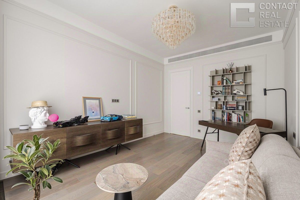 Просторная 5-комнатная квартира площадью 413 м² с французскими балконами, панорамными видами на Патриаршие пруды и дровяным камином — настоящее воплощение роскоши и комфорта в сердце престижного района. Основные особенности квартиры: светлая гостиная 75 м² с радиусными панорамными окнами, дровяным камином и видом на легендарные Патриаршие пруды, элегантная кухня-столовая 34 м² для семейных ужинов и встреч с друзьями, гардеробная 37 м², которая может служить гостевой спальней или рабочим пространством, мастер-спальня 56 м² с просторной гардеробной и окнами в ванной комнате для максимального уюта, две детские спальни, одна из которых с эффектным стеклянным эркером, каждая со своим санузлом и душевой кабиной. Подсобные помещения: гостевой санузел, постирочная комната и холл с вместительной гардеробной. Дизайнерский ремонт выполнен с использованием натурального камня и ценных пород дерева, создавая атмосферу изысканности. Остекление на четыре стороны обеспечивает обильное естественное освещение в течение дня. В интерьере гармонично сочетаются современные технологии и высококлассные материалы. Квартира оснащена премиальной техникой: кондиционирование Daikin, телевизором Loewe, аудиосистемой B&W и McIntosh для высокого качества звука. Для владельцев предусмотрены два парковочных места в подземном паркинге.