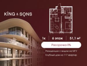 KING & SONS это клубный дом на 117 резиденций премиум-класса, расположенный на престижной и исторической улице Мосфильмовская. Из большинства квартир открываются панорамные виды на МГУ, ''Москву-Сити'', особняки посольств и парки. Это место для тех, кто не хочет выбирать между комфортом мегаполиса и уединением на природе.Проект разработан международным архитектурным бюро, которое входит в ТОП-2 в мире. Фасады из натурального камня, мягкие формы здания, максимально открытое остекление, окна в пол — все это делает облик здания выразительным и уникальным.В проекте предусмотрено 70% квартир с террасами. Потолки от 3,2 до 4,7 м. Паркинг на 110 машиномест.Для будущих резидентов продуманы разнообразные общественные пространства зимний сад в лобби первого этажа, секретный сад с зоной открытого огня, лаундж-зона с кинотеатром на крыше, собственный спортзал, зоны для занятий йогой и медитацией.KING & SONS это фамильная недвижимость, которую с гордостью передают по наследству