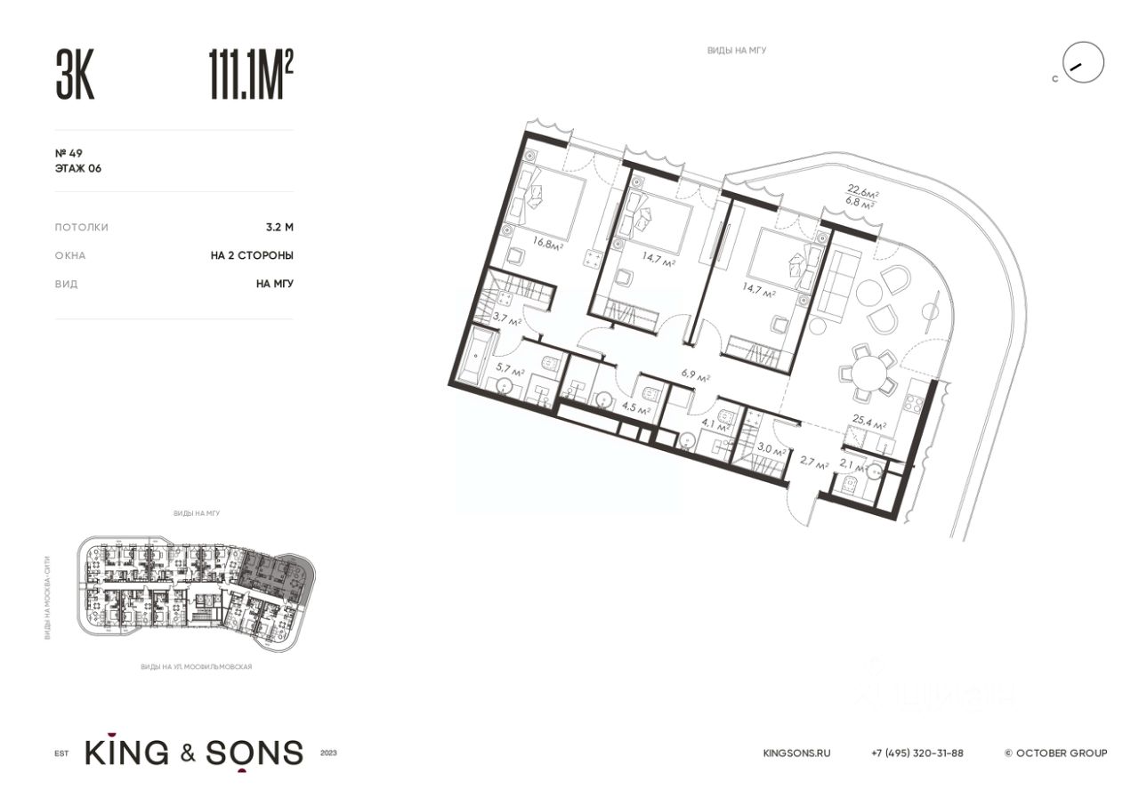 KING & SONS это клубный дом на 117 резиденций премиум-класса, расположенный на престижной и исторической улице Мосфильмовская. Из большинства квартир открываются панорамные виды на МГУ, ''Москву-Сити'', особняки посольств и парки. Это место для тех, кто не хочет выбирать между комфортом мегаполиса и уединением на природе. Проект разработан японским архитектурным бюро NIKKEN. Фасады из натурального камня, мягкие формы здания, максимально открытое остекление, окна в пол — все это делает облик здания выразительным и уникальным. В проекте предусмотрено 70% квартир с террасами. Потолки от 3,2 до 4,7 м. Паркинг на 110 машиномест. Для будущих резидентов продуманы разнообразные общественные пространства зимний сад в лобби первого этажа, секретный сад с зоной открытого огня, лаундж-зона с кинотеатром на крыше, собственный спортзал, зоны для занятий йогой и медитацией. KING & SONS это фамильная недвижимость, которую с гордостью передают по наследству, как искусство и бриллианты.