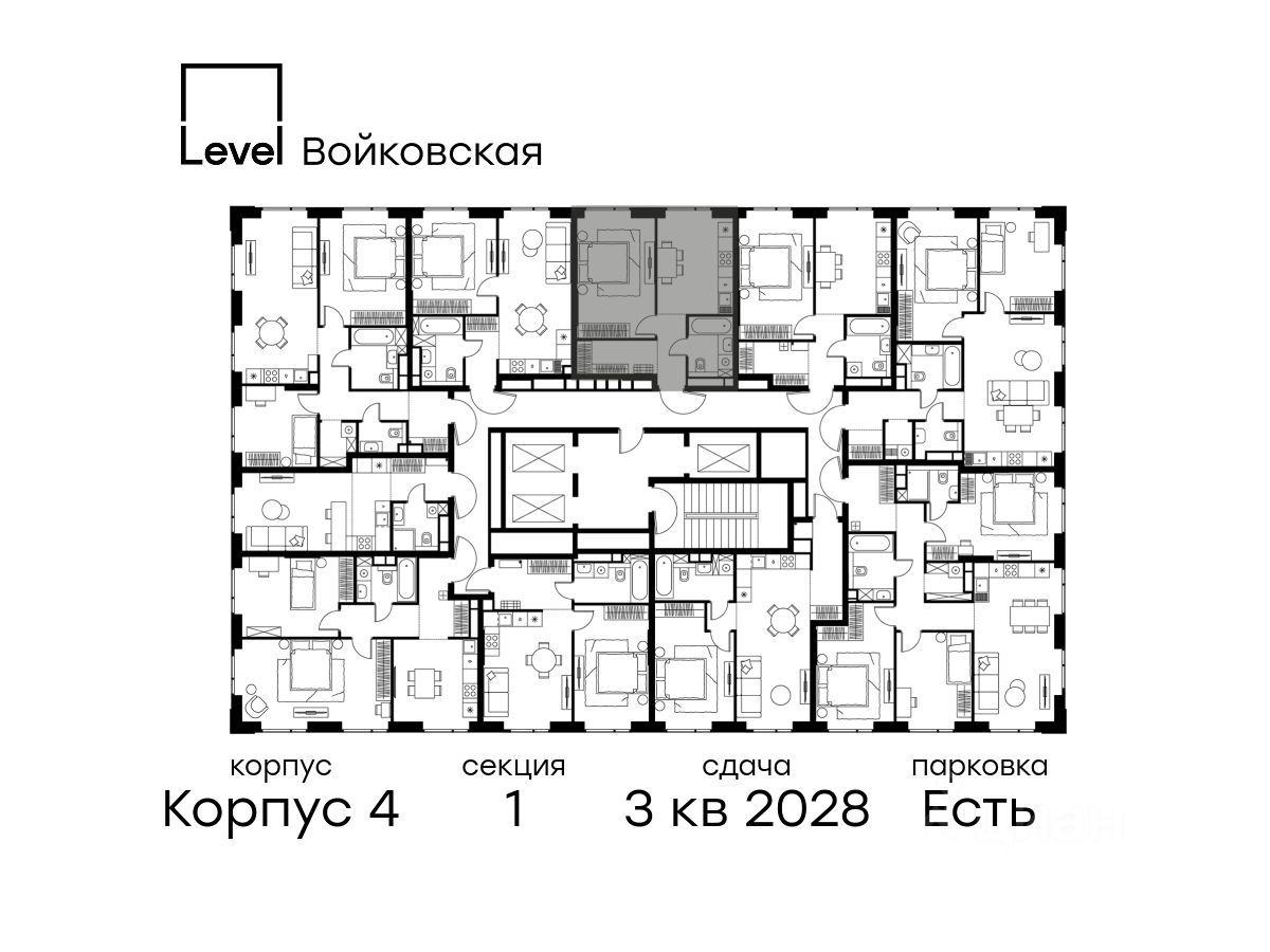 Цена указана с учётом скидки при 100%-й оплате, несубсидированной ипотеке, рассрочке (кроме программы ''Рассрочка 0%''). Продается 4-комнатная квартира площадью 99.40 кв. м с отделкой. Квартира находится на 21 этаже 26-этажного корпуса 4, в новом жилом комплексе бизнес-класса Левел Войковская, расположенном рядом с живописным заповедником ''Покровское-Стрешнево'' (застройщик - компания Level Group/Левел групп). Прекрасная транспортная доступность - 7 мин. пешком до станции МЦК ''Балтийская'', - 15 мин. пешком до станции метро ''Войковская'', - 8 мин. на машине до ТТК, - 15 мин. на машине до центра Москвы, - 20 мин. на машине до Москва-Сити. Продуманный архитектурный проект - стильная архитектура от мастерской Фефелова В. В., - панорамные виды на парки, Химкинское водохранилище и Останкинскую башню, - лобби с высотой потолков до 6,45 метров, - более 20 видов планировочных решений, включая редкие форматы квартир с террасой и увеличенной высотой потолков до 5,42 метров, - 2 варианта дизайнерской отделки в корпусе 4, предлагаются как дополнительная опция к отделке white box: стиль Modern в светлых холодных тонах и стиль Classic в нейтральной бежевой гамме. Квартиры в корпусах 3 и 5 сдаются без отделки. Расположение Левел Войковская строится в престижном Северном округе Москвы. Развитая инфраструктура и живописная природа переплетаются в единый ансамбль, столь значимый для комфортной жизни. Войковский район окружают парки и набережные. В шаговой доступности - парк ''Покровское-Стрешнево'', не более 15-ти минут на велосипеде занимает путь до Тимирязевского парка и 9-ти минут до парка усадьбы Михалково. Рядом более 60 школ, 75 дошкольных учреждений, 17 государственных и 6 частных вузов, 25 супермаркетов, 4 торговых центра, среди которых ТЦ ''Метрополис'' и ТЦ ''Авиапарк''. Внутренняя инфраструктура На территории жилого комплекса предусмотрены коммерческие помещения: кафе, ресторан, пекарня и другие сервисы откроются на первых этажах корпусов. Для жителей будет доступен отапливаемый подземный паркинг на 244 машино-места с доступом с любого этажа на лифте. На территории паркинга будет расположено 125 кладовых помещений для хранения сезонного инвентаря. Лобби и благоустройство Дизайн лобби Левел Войковская создан совместно с бюро BLANK. Это уютные гостиные, где хочется задержаться. Теплая цветовая гамма, ресепшен, зоны ожидания, лапомойки и гостевые санузлы - каждая деталь превращает лобби в комфортное продолжение вашего дома. 1,15 га площади в первых двух этапах строительства отведено под приватный внутренний двор, который спроектирован совместно с бюро ''Правда''. Детские площадки для всех возрастов, спортивные пространства для йоги, воркаута и петанка, уютные зоны для тихого отдыха или работы. Здесь утро начинается с вдохновения, а вечер наполнен приятными моментами. Лифты Комфортное перемещение внутри жилого комплекса будут обеспечивать надёжные лифты с доступом в паркинг с жилых этажей. В каждом корпусе предусмотрено по 3 грузопассажирских лифта.