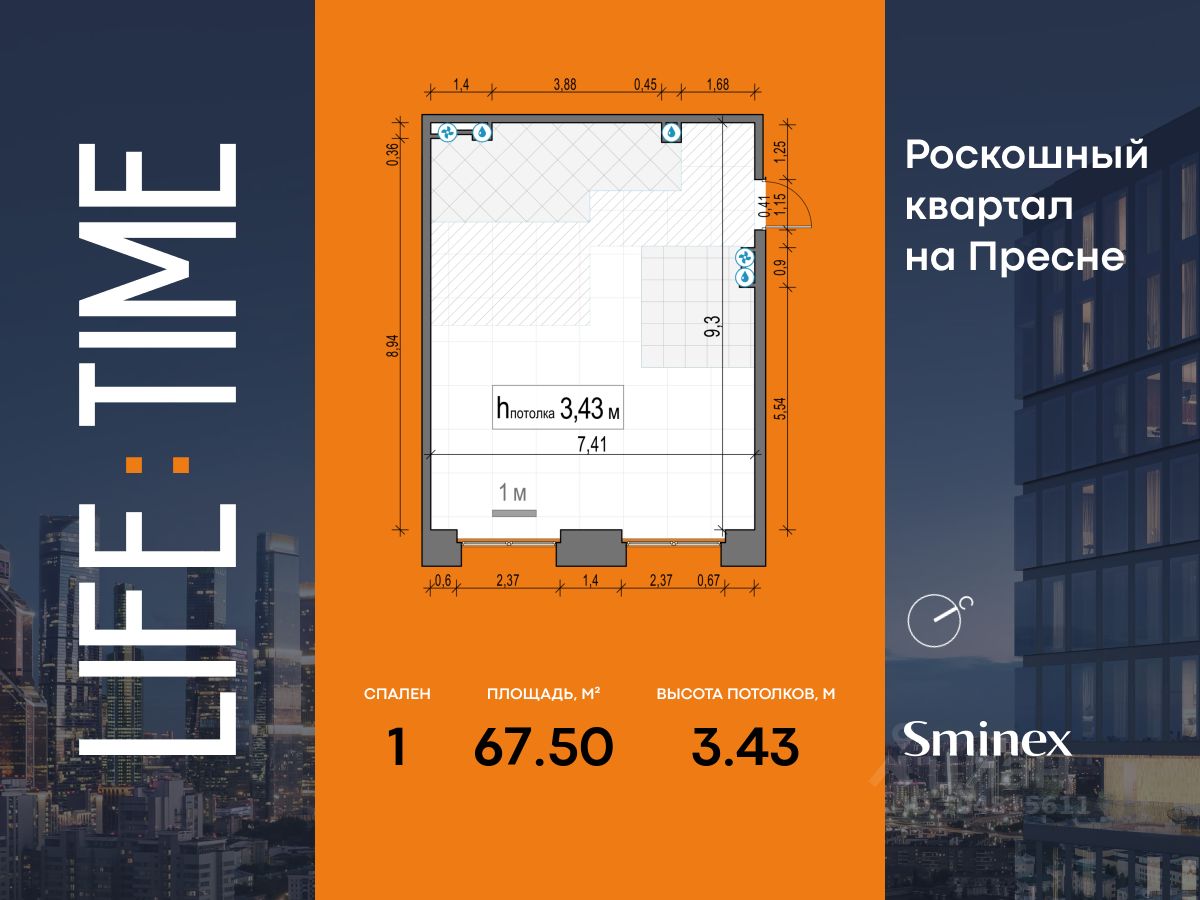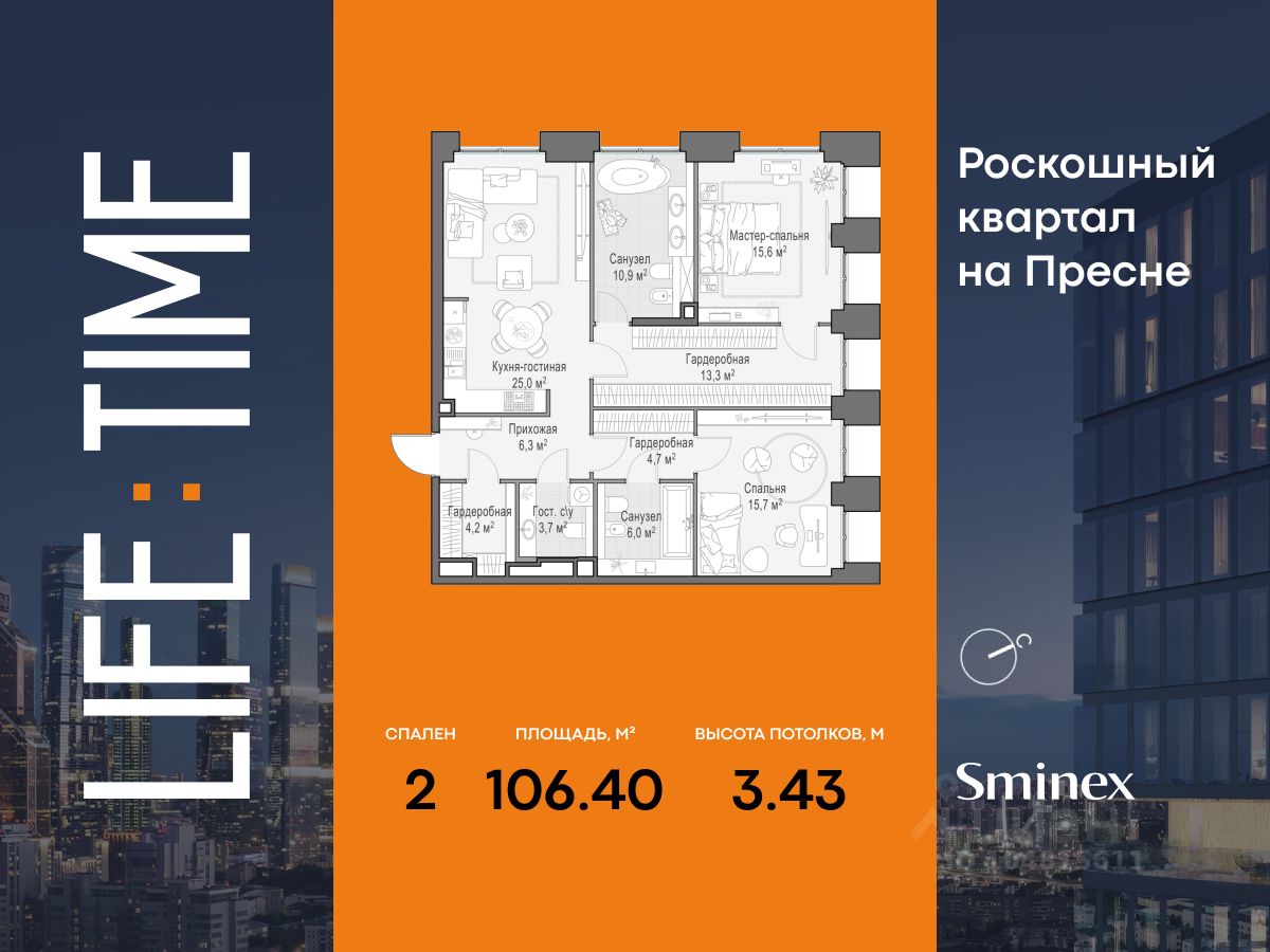 Просторная светлая квартира площадью 99,5 кв. м с окнами на восточную сторону, выходящими на гостиницу ''Украина'', Кудринскую площадь и тихую улицу Сергея Макеева, которая является односторонней. Панорамные окна шириной 2,38 метра с возможностью открывания настежь улучшают видовые характеристики квартиры. Продуманная планировка позволяет разместить две спальни с отдельными санузлами и гардеробными. Life Time - роскошный современный квартал на Пресне, в наиболее быстро растущем премиальном районе ЦАО. Его насыщенная инфраструктура и выгодное расположение дарят время для жизни. Вы больше не тратите его на дорогу или ожидание, при этом ни в чём себе не отказывая. На территории предусмотрено всё для комфортной жизни: • двор-парк площадью 1,8 гектара с прудом и фонтанами, • Clubhouse - инфраструктурный центр в отдельном здании с исчерпывающими возможностями для спорта, отдыха и досуга только для жителей, • спортивная инфраструктура на улице и в помещении, в том числе бассейн длиной 25 метров, хот-таб, хаммам, сауна, бьюти-зона, • клубная гостиная с террасой, • всё для развития и досуга детей любого возраста, в том числе детский сад и школа. Life Time находится в центре сложившегося премиального района, в окружении многочисленных парков. Удобная транспортная доступность и прямой выезд на Звенигородское шоссе позволяют без проблем добраться до Садового кольца и Москва-Сити. Архитектурный стиль квартала - роскошный минимализм. Дома десятилетиями будут выглядеть современно.