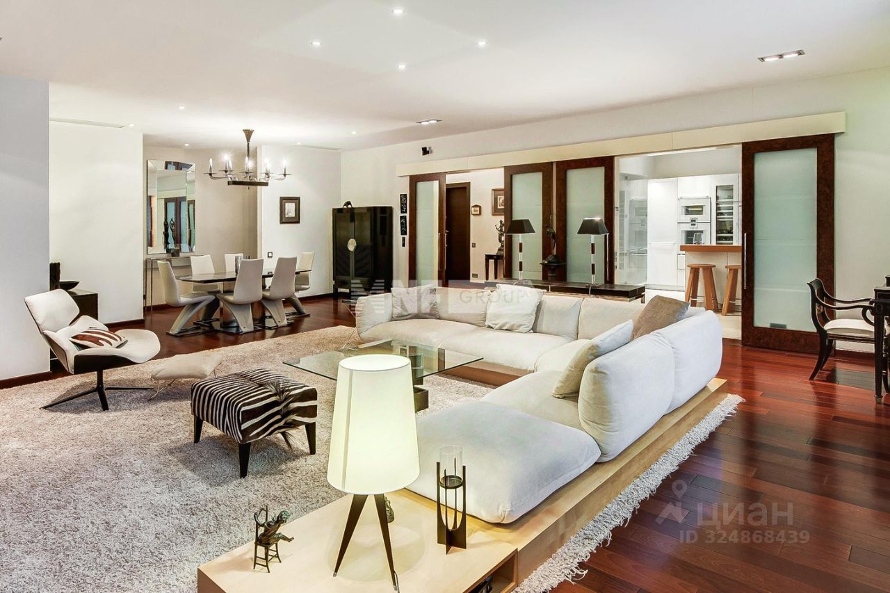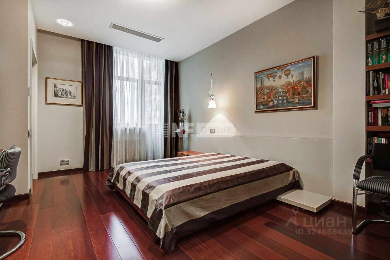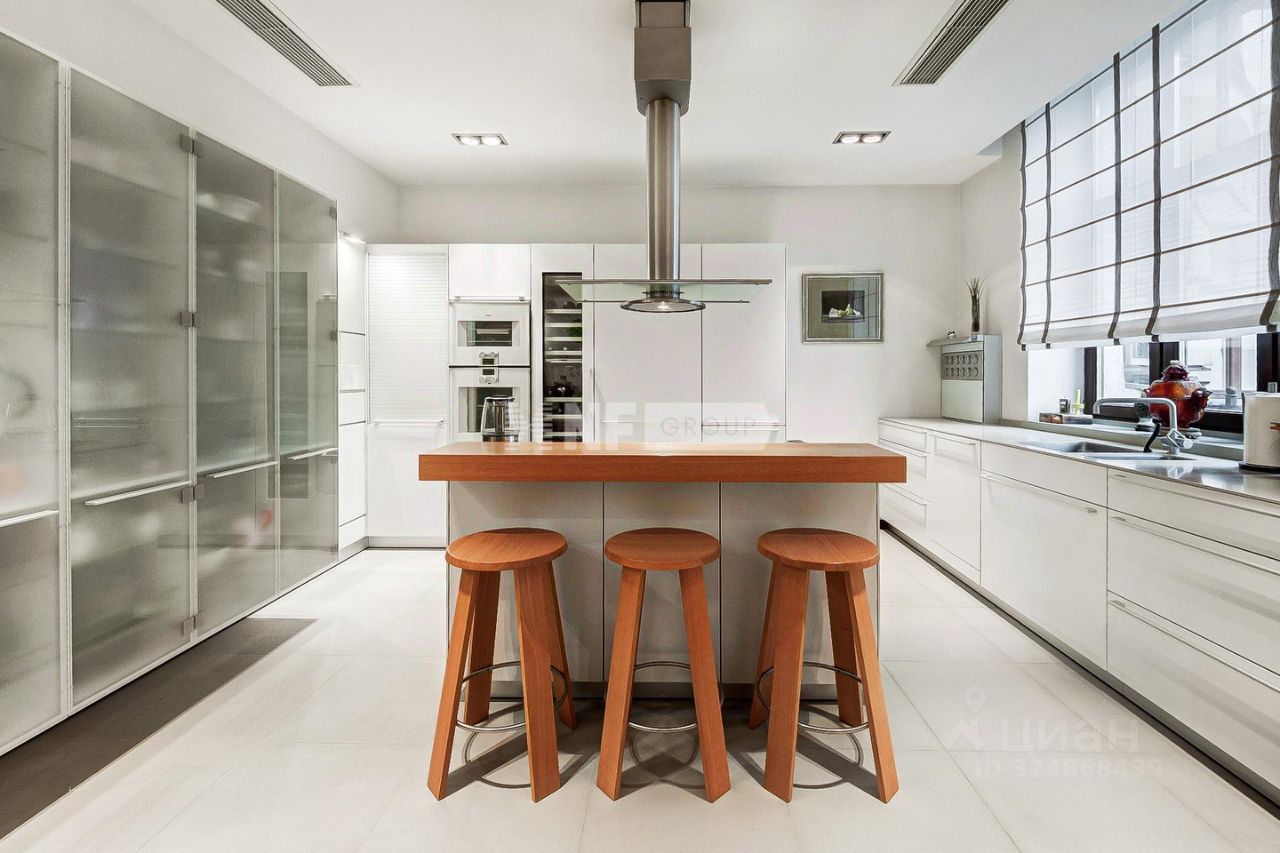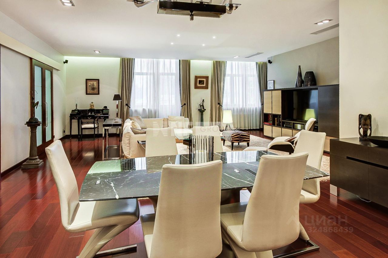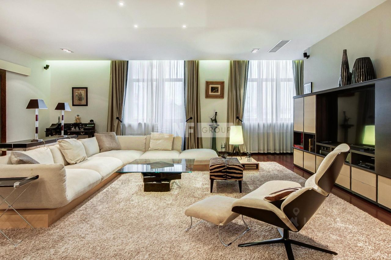 ID 585704 Видовая квартира с исключительной отделкой по проекту английского дизайнера в малоквартирном доме на улице Спиридоновка. Квартира площадью 173,3 кв.м. на 8 этаже с панорамными видами на тихий центр. Квартира продается со всей обстановкой под ключ - включая мебель, технику, шторы на электроприводе, ковры. Функциональное планировочное решение: просторная гостиная, кухня-столовая, мастер блок, состоящий из спальни, гардеробной и санузла, вторая спальня со своим санузлом, кабинет (можно использовать как третью спальню), гостевой санузел, постирочная. Итальянская кухня укомплектована всей необходимой техникой Gaggenau (духовой шкаф, варочная панель, микроволновая печь, посудомоечная машина, холодильник), винный шкаф EuroCave. Пол в коридоре и на кухне с подогревом - натуральный мрамор, американский паркет - массив ореха, стены - натуральная кожа и шелк. Раковина в мастер-санузле выполнена из оникса, сантехника Villeroy & Boch, Washlet. Постирочная оборудована стиральной и сушильной машинами Miele. Вся мебель в квартире изготовлена по индивидуальному заказу и привезена из Италии, диван и кресла в гостиной представлены от Armani. В квартире установлена центральная система кондиционирования Daikin. Интегрирована система ''Умный дом'' и уникальная аудиосистема со скрытыми музыкальными колонками. Имеется собственный бойлер. Окна от лучшего немецкого производителя Wessel-fenstertechnik имеют уникальную структуру и остекление поверх дерево-алюминиевой рамы (индивидуальное исполнение под проект квартиры). Огороженная территория дома с просторной наземной парковкой. Двор и прилегающая территория утопают в зелени. В шаговой доступности - МХАТ Горького, театр Маяковского, Геликон Опера, Консерватория и Кремль. Номер объекта: #1/585704/14501