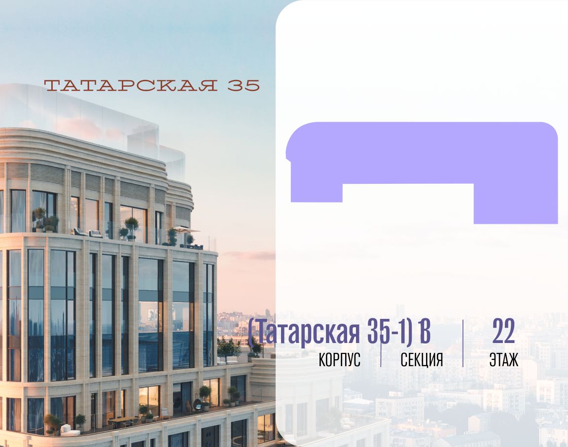 Продается просторная квартира площадью 188.60 м2 в жилом комплексе ТАТАРСКАЯ, 35. Квартира находится в 1 секции корпуса 3. Этаж 22-й из 24. Квартира без чистовой отделки, с просторной кухней 49.30 м2. Жилая площадь 63.80 м2. Высота потолка от 3.50. ТАТАРСКАЯ, 35 - новая архитектурная доминанта Замоскворечья, достопримечательность на фотопанорамах исторического центра Москвы. Элитный дом, созданный для тех, кто умеет смотреть далеко вперед, мыслить масштабно и воплощать собственный сценарий жизни. Вдохновляющие прогулки по променаду набережной, в уютных переулках, в парке ''Зарядье'', в Михайловском саду и Репинском сквере. Наслаждение высоким искусством в Третьяковской галерее, Доме Музыки, театральном музее им. А.А. Бахрушина, театре на Малой Ордынке. За окнами - Кремль, высотка на Котельнической, панорамы Замоскворечья и острова Балчуг, огни Садового кольца. Собственные спорт-румы, детская, репетиторская, бьюти-пространства, деловое пространство с коворкингом, переговорной и сигарной. Собственный трехуровневый фитнесс-центр с бассейном, тренажерным залом, сауной, хаммамом, массажным кабинетом. Площадь двора - 1,8 га, половина территории покрыта деревьями, кустарниками и лужайками. Дом расположен внутри Садового кольца - отсюда в считанные минуты можно добраться до важнейших мест столицы: достопримечательностей и парков, театров и ресторанов, деловых и административных центров. 7 минут до Кремля на автомобиле, 15 минут до Третьяковской галереи и 8 минут до Садового кольца пешком. Планировочные решения и визуализации предварительны, возможны изменения.