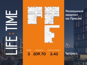 Просторная светлая квартира площадью 166,4 кв. м с окнами, выходящими в тихий приватный двор-парк с ландшафтным дизайном и на парк ''Красногвардейские пруды''. Панорамное остекление улучшает видовые характеристики квартиры. Продуманная планировка позволяет разместить кухню-гостиную и три спальни.Life Time - роскошный современный квартал на Пресне, в наиболее быстро растущем премиальном районе ЦАО.Его насыщенная инфраструктура и выгодное расположение дарят время для жизни. Вы больше не тратите его на дорогу или ожидание, при этом ни в чём себе не отказывая.На территории предусмотрено всё для комфортной жизни:• двор-парк площадью 1,8 гектара с прудом и фонтанами,• Clubhouse - инфраструктурный центр в отдельном здании с исчерпывающими возможностями для спорта, отдыха и досуга только для жителей,• спортивная инфраструктура на улице и в помещении, в том числе бассейн длиной 25 метров, хот-таб, хаммам, сауна, бьюти-зона,• клубная гостиная с террасой,• всё для развития и досуга детей любого возраста, в том числе детский сад и школа.Life Time находится в центре сложившегося премиального района, в окружении многочисленных парков. Удобная транспортная доступность и прямой выезд на Звенигородское шоссе позволяют без проблем добраться до Садового кольца и Москва-Сити.Архитектурный стиль квартала - роскошный минимализм. Дома десятилетиями будут выглядеть современно.